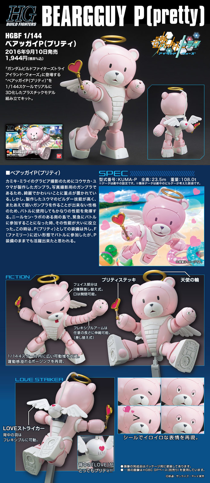 人氣高漲的熊亞凱(Beargguy)讓不少女孩也開始動手組裝模型,這次日BANDAI萬代玩具公司的HGBF組裝模型系列將再推出「熊亞凱P」ベアッガイP(プリティ)的粉紅天使版本(暫時翻譯),想必是會讓少女再次掏錢購買的,或是也有男性玩具人可以送給女姓朋友歐!感覺可以意外成為"送禮自用"兩相宜的模型商品。