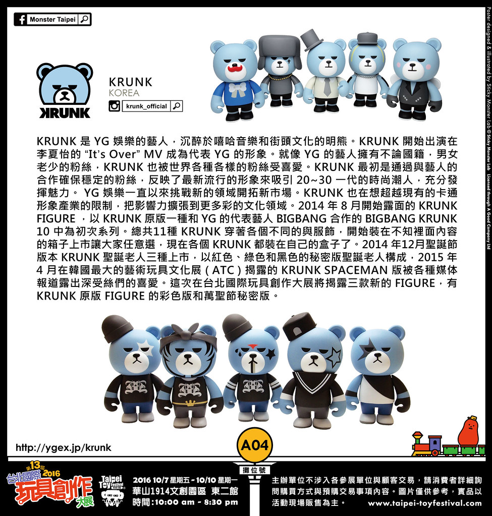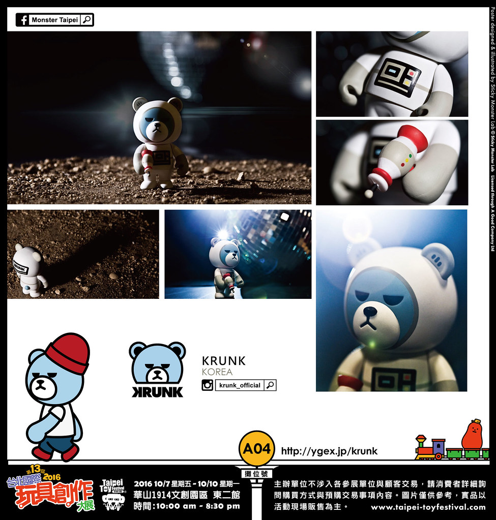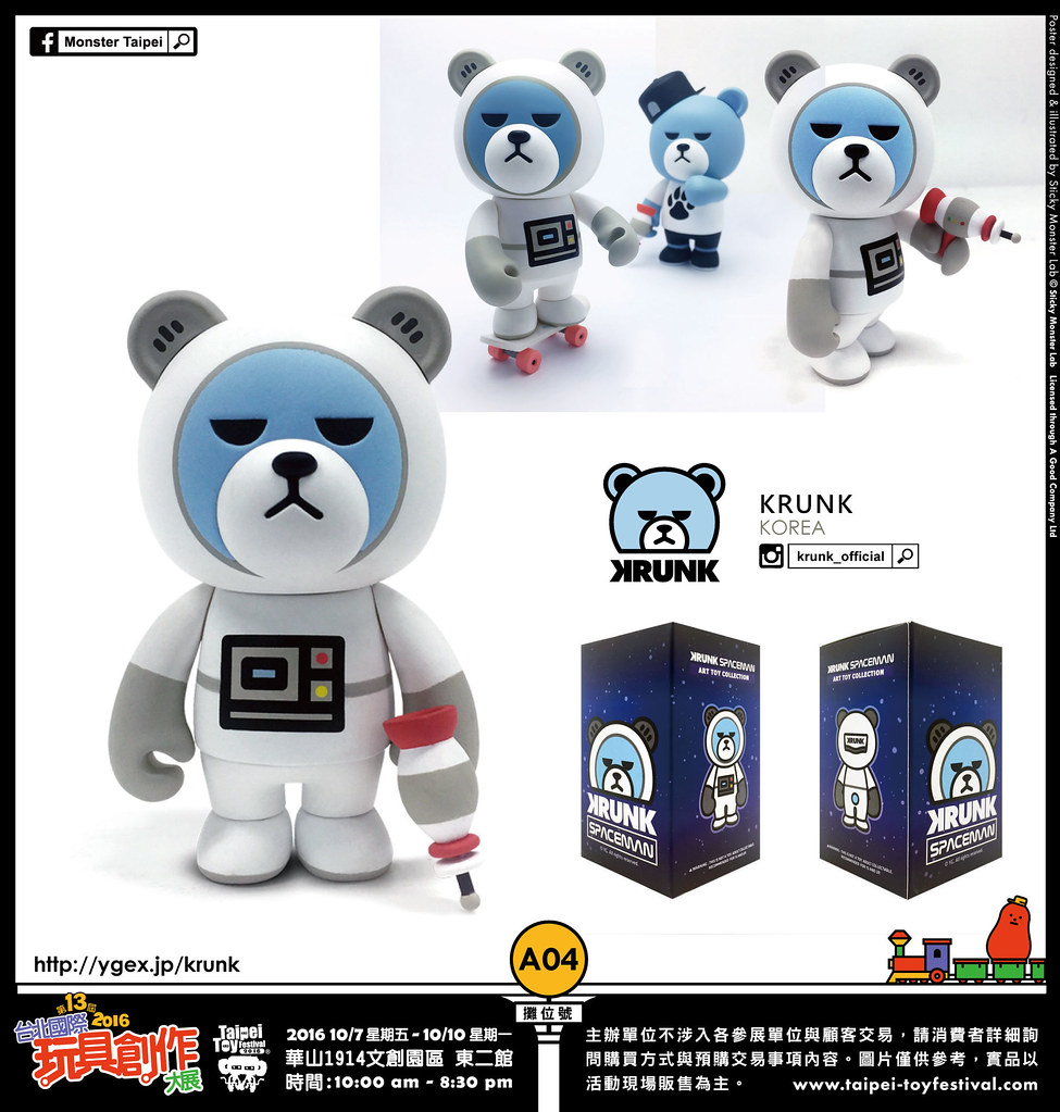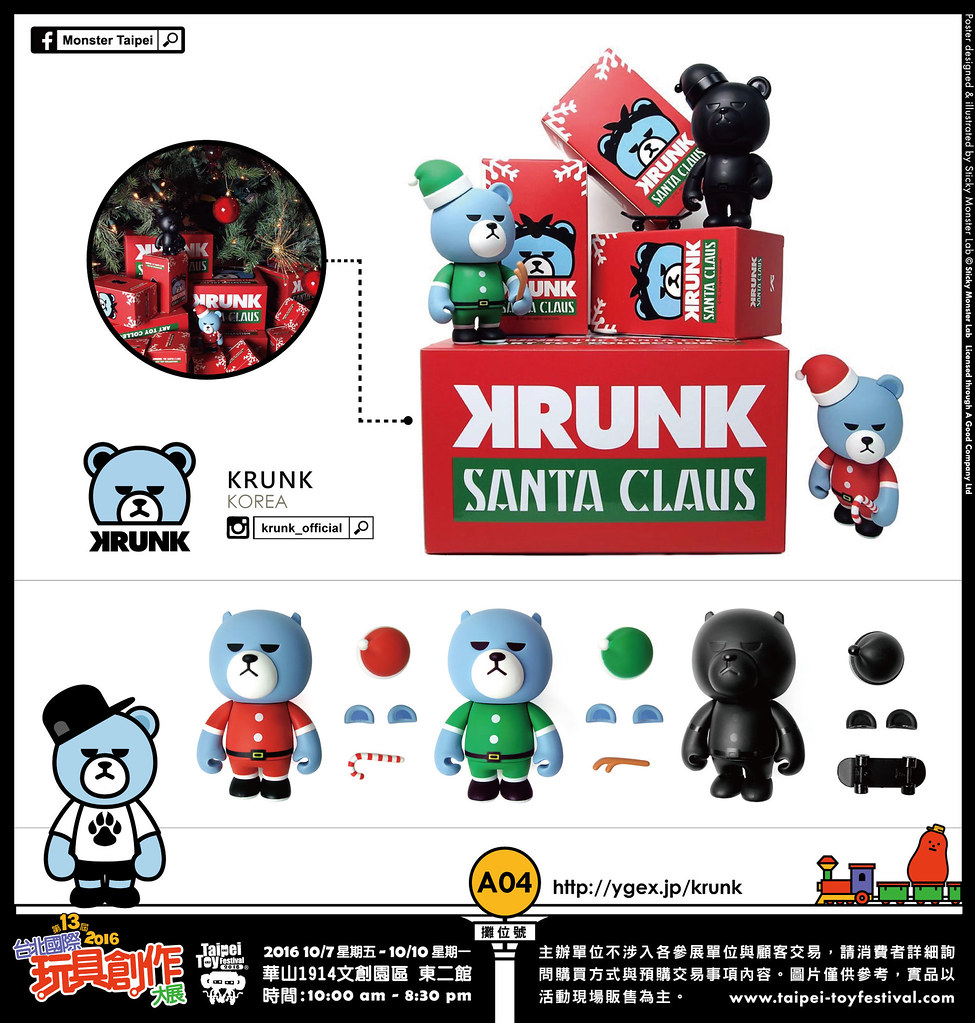 2014 年12月聖誕節版本 KRUNK 聖誕老人三種上市,以紅色、綠色和黑色的秘密版聖誕老人構成,2015 年4 月在韓國最大的藝術玩具文化展 ( ATC ) 揭露的 KRUNK SPACEMAN 版被各種媒体報道露出深受絲們的喜愛。這次在台北國際玩具創作大展將揭露三款新的 FIGURE,有KRUNK 原版 FIGURE 的彩色版和萬聖節秘密版。