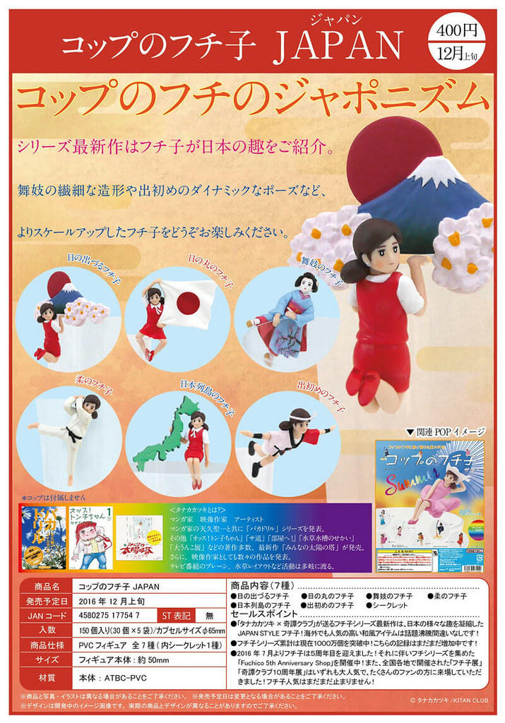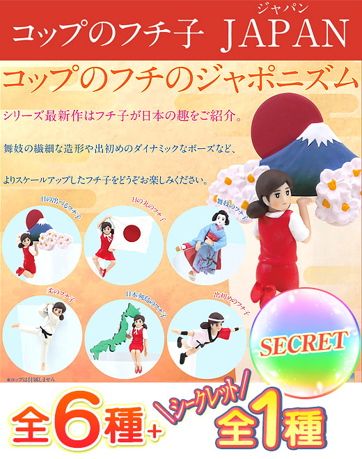 奇譚俱樂部(KITAN CLUB)旗下最火紅的「杯緣子」(コップのフチ子)系列這次推出以「日本」(JAPAN)為主題的杯緣子作品可說是相當的可愛啊,七款作品包括:富士山日出杯緣子(日の出づるフチ子)、日本國旗杯緣子(日の丸のフチ子)、歌舞伎杯緣子(舞妓のフチ子)、柔道杯緣子(柔のフチ子)、日本列島杯緣子(日本列島のフチ子)、消防出初式杯緣子(出初めのフチ子)以及隱藏款。