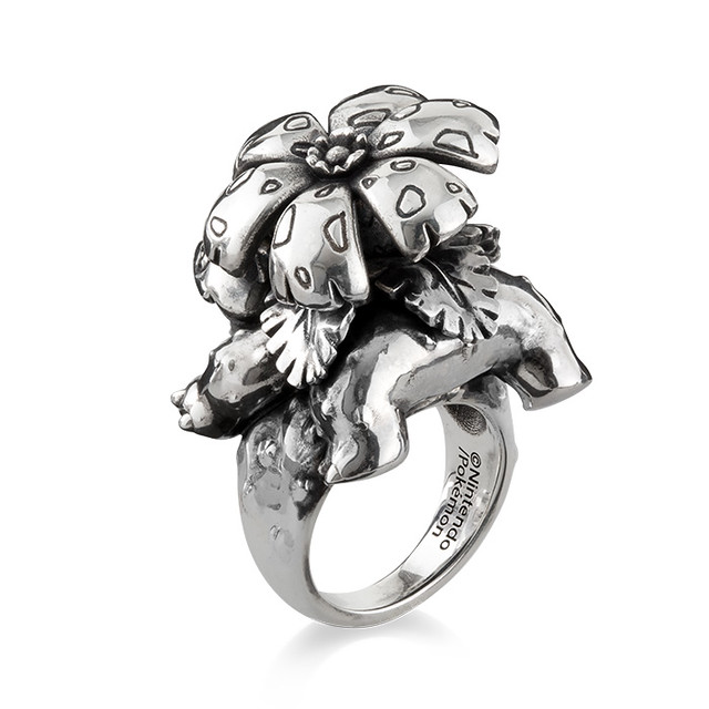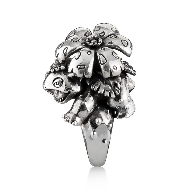 首先是妙蛙花戒指,妙蛙花背部巨大的花朵是他的特徵,花朵的紋路、粗大的莖部以及葉子的輪廓都非常細膩的刻劃了出來,忠實還原了設定中的姿態。妙蛙花戒指也是3隻裡面最具有份量感的商品,戴在手上後,他的花朵彷彿會散發出香氣,雖然沒有人聞過,應該不是臭的。喜愛草系寶可夢的你絕對適合這款妙蛙花戒指喔!