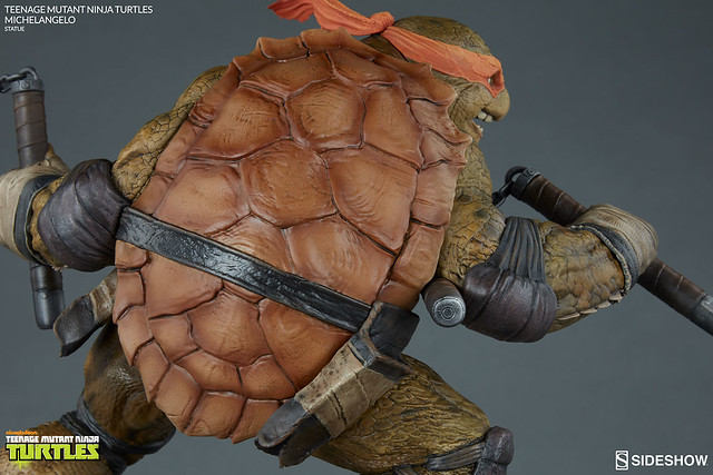 這次所推出的「米開朗基羅」雕像作品,有別於之前所推出忍者龜的相關可動或是雕像作品,是由Sideshow Collectibles 公司內部所企劃的全新忍者龜雕像系列,可說是維持經典的忍者龜漫畫中的設定,但卻將其造型進行了擬真化的步驟,將真實品種的烏龜融入了整體造型的設定當中,特別是在李奧納多烏龜皮膚質感細節的雕刻部分,搭配著精湛的塗裝上色技巧,將這款雕像作品表現的微妙微翹。