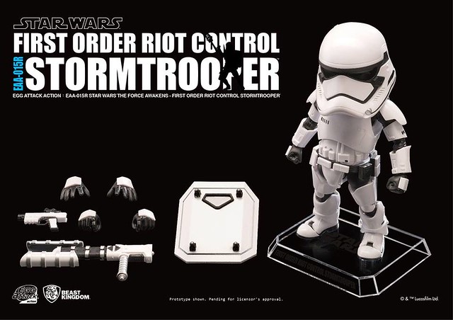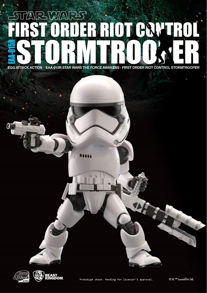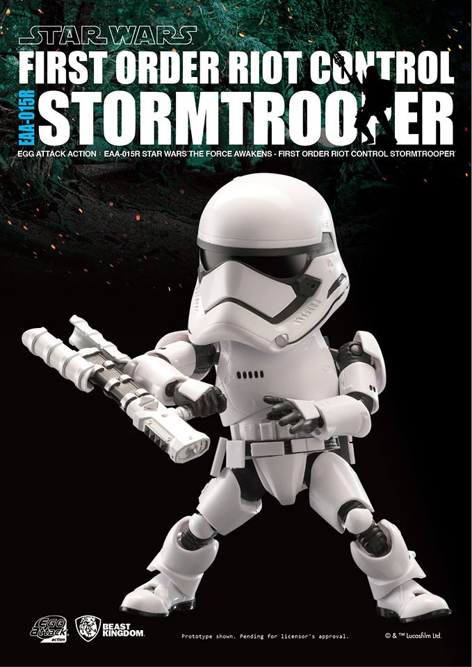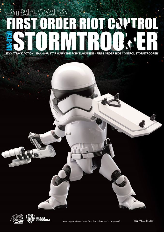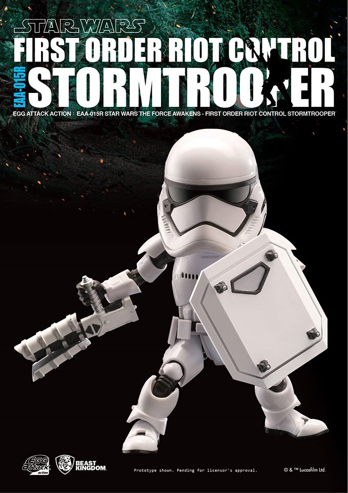 野獸國(Beast Kingdom)公司旗下非常火紅的Egg Attack Action 可動公仔系列,繼推出了第一軍團(First Order)「風暴兵」(Stormtrooper)的作品之後,而這次所要推出的角色則是在「塔可達納星球」(Takodana)上,芬恩在拿到光劍之後所碰上的第一軍團特殊兵種「鎮暴風暴兵」(First Order Riot Control Stormtrooper)。
