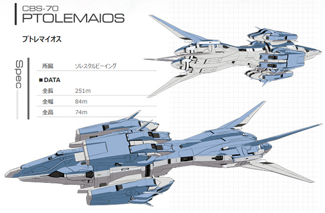 在《機動戰士鋼彈00》第一季中,私設武裝組織天上人為了迅速投入鋼彈執行各種任務,使用多用途MS運輸艦「托勒密號」搭載四架鋼彈,船身前半是發射台,旁邊設有四座格納庫,出擊時會將格納庫旋轉至正上方,降下鋼彈到發射台上。由於托勒密號和鋼彈同樣使用GN粒子作為動力,但艦內並沒有搭載太陽爐,需從格納庫內儲存待機中的鋼彈生產的GN粒子。同時托勒密號沒有重型武裝,需要仰賴鋼彈進行防衛,這時格納庫可以當成甲板使用,以利鋼彈應對各個方位的敵人。
