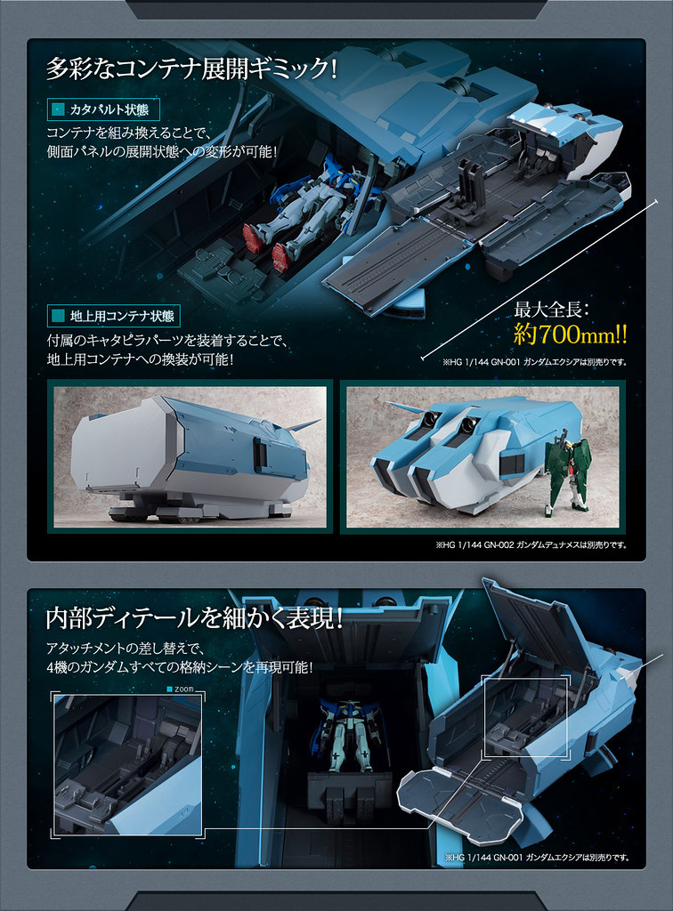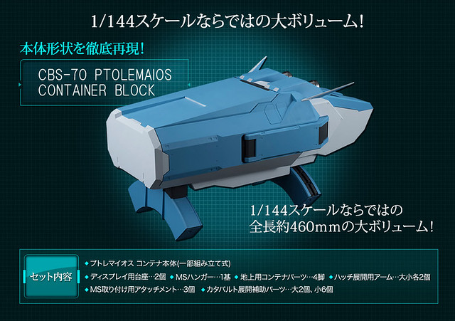 「Realistic Model Series 托勒密號 鋼彈格納庫」以1/144比例製作,全長約46公分,可適用於HG、RG等1/144比例的鋼彈模型。整體的分色相當完整,格納庫中的油壓管、機械臂,鋼彈用的支架、發射器也都完整重現。透過零件的交換,格納庫能夠呈現套件原創的完全展開,全長約70公分的機體發射模式、將底部換上履帶的陸地用格納庫等多種樣式。
