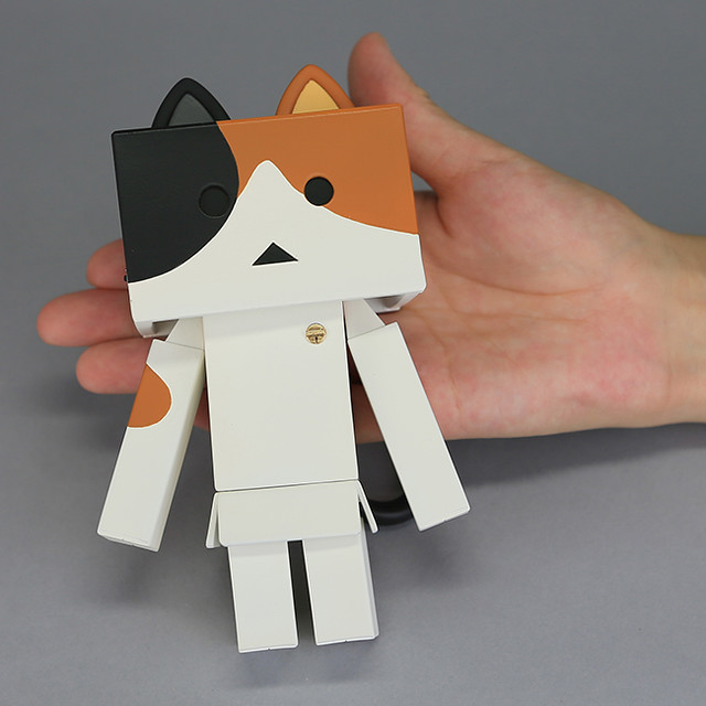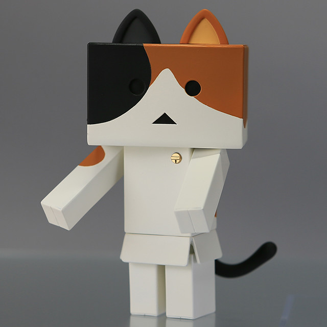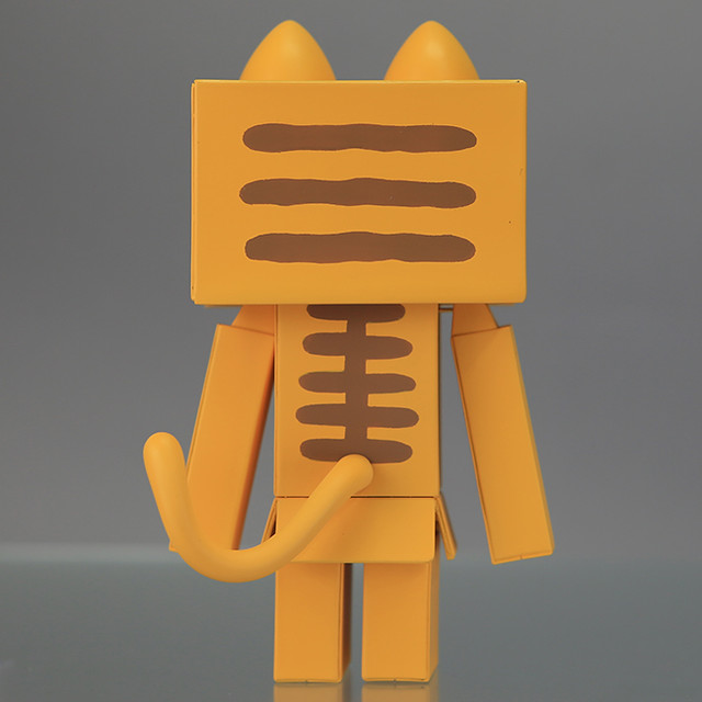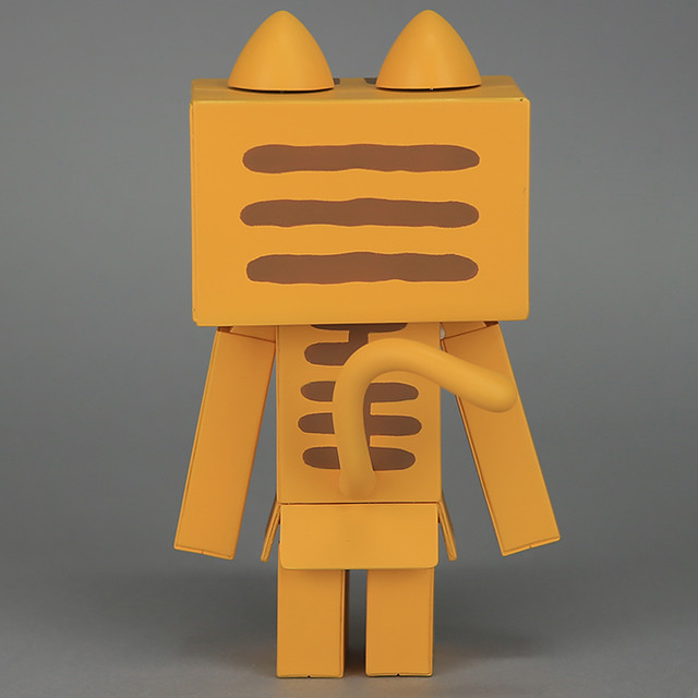 這次「Sofubi Toy Box006 貓咪阿楞」共有兩種款式,分別為三色與虎斑,全高約13公分,是眾多商品中比較大型的。貓咪阿楞胸前的投幣口及側邊的開關使用亮面金屬色增添質感,在頸部、雙手、尾巴四處設有可動關節,能做出一些簡單的動作。