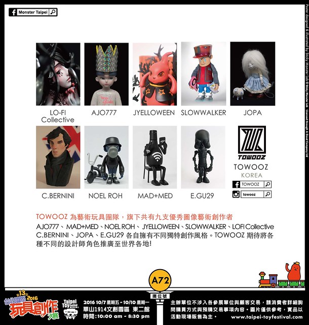 TOWOOZ 為藝術玩具團隊,旗下共有九支優秀圖像藝術創作者:AJO777、 MAD+MED、NOEL ROH、 JYELLOWEEN、SLOWWALKER、LOFI Collective、C.BERNINI、JOPA、E.GU29 各自擁有不同獨特創作風格。TOWOOZ 期待將各種不同的設計師角色推廣至世界各地!