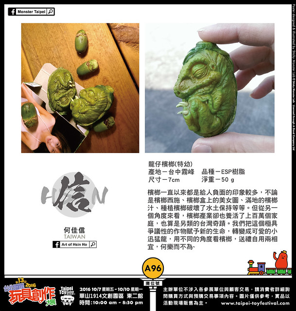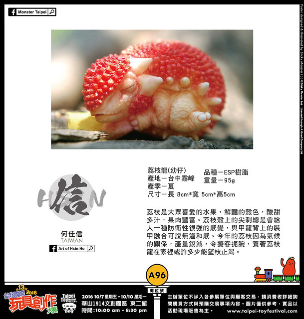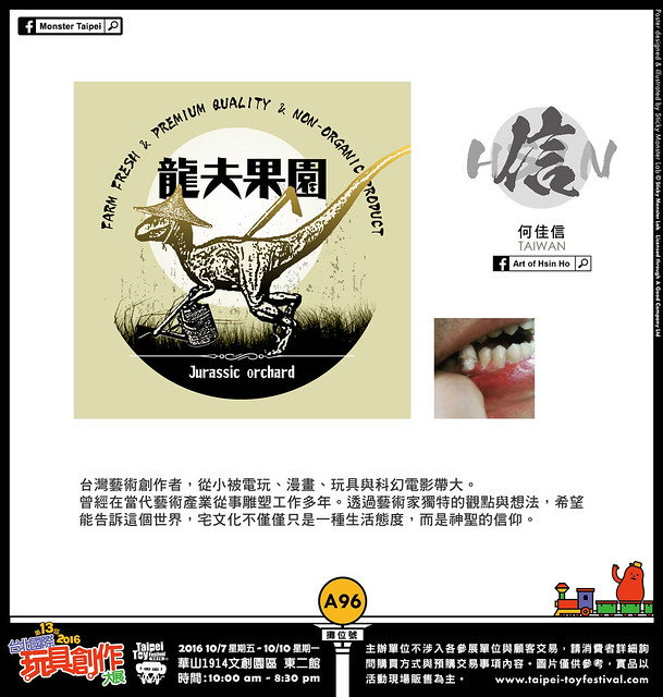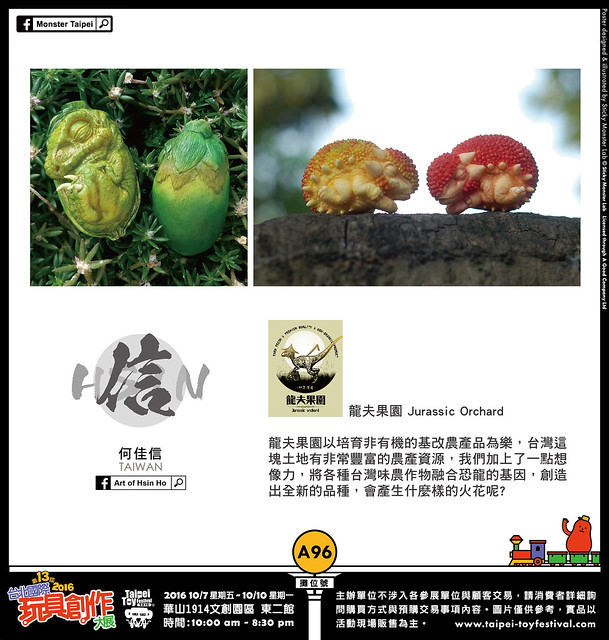 活動展覽 設計師玩具 TTF 台北國際玩具創作大展2016 參展廠商介紹:Art of Hsin Ho 熊倒 2016-09-21 15:18:23 分享 ✕ 分享 已複製網址 分享到 Facebook 分享到 LINE 分享到 Reddit 分享到 Twitter 分享到 Plurk 分享到微博 A96:Art of Hsin Ho(TAIWAN) Art of Hsin Ho 台灣藝術創作者,從小被電玩、漫畫、玩具與科幻電影帶大。曾經在當代藝術產業從事雕塑工作多年。透過藝術家獨特的觀點與想法,希望能告訴這個世界,宅文化不僅僅只是一種生活態度,而是神聖的信仰。龍夫果園 Jurassic Orchard 龍夫果園以培育非有機的基改農產品為樂,台灣這塊土地有非常豐富的農產資源,我們加上了一點想像力,將各種台灣味農作物融合恐龍的基因,創造出全新的品種,會產生什麼樣的火花呢? 熊倒 玩具熱愛者與情色蒙面藝術家的Rockin'Jelly Bean的信徒。對12吋、吊卡玩具以及復古造型有莫名的狂熱。