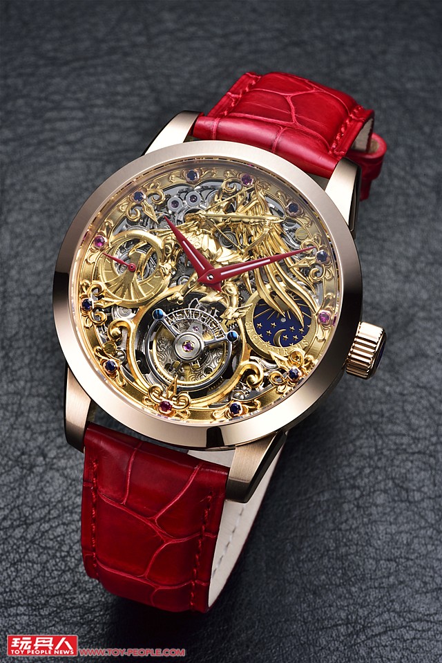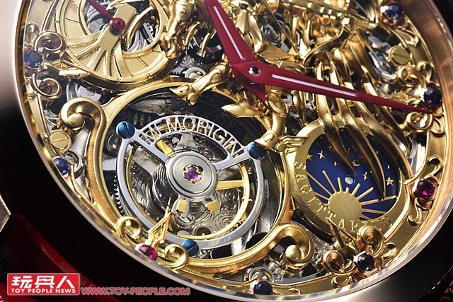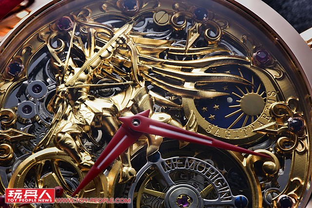 第一眼看到這只錶,很難不被他12點鐘方向的黃金射手浮雕所吸引,整個面盤採用了鏤空設計,可以欣賞到機芯內部的機械零件。3點鐘位置的日夜顯示錶盤,星辰與太陽的設計呼應了星座神話的概念。
