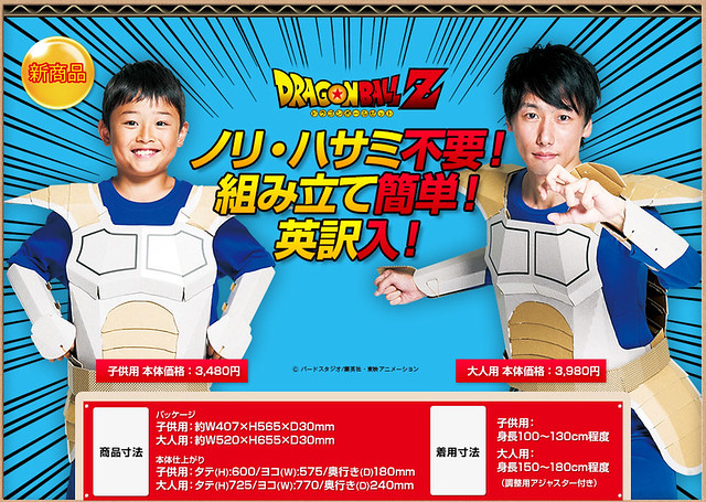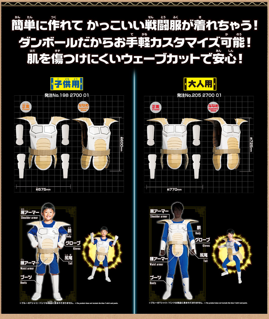 『着れちゃう!ダンボール ドラゴンボールZ 戦闘服編』是以《七龍珠》中的經典道具「戰鬥服」為主題所推出的商品。一共有大人與小孩兩種版型,大人適用於150~180公分,而兒童版適用於100~130公分。 藉由摺紙與卡楯的造形設計,自組的全程中完全不需要剪刀與膠水,就算是小孩子也能夠輕鬆完成!~ 除此之外,紙箱的邊緣還使用了特殊處理,不會刮傷皮膚。