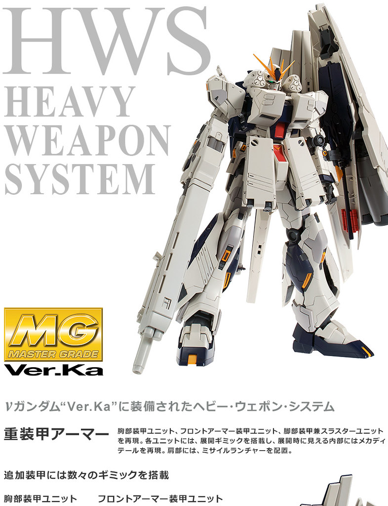 「MG 1/100 ν鋼彈 Ver.Ka用 HWS擴充套件」包含了「胸部增裝裝甲組件」、「前裙甲增裝裝甲組件」、「腿部增裝裝甲兼推進器組件」、「肩部增裝飛彈發射器」、「超絕MEGA護盾 × 1」、「超絕MEGA步槍 × 1」以及「"Ver.Ka" 水貼紙」。