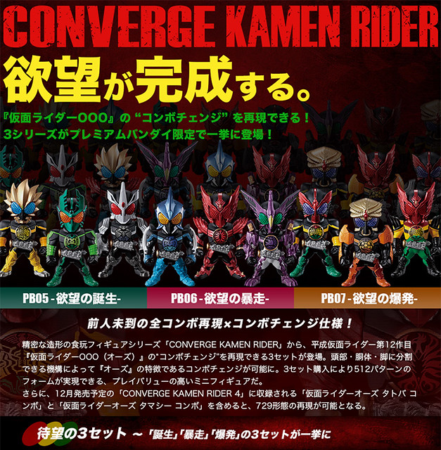 日Bandai萬代玩具公司的食玩事業部門以《假面騎士》為題材的「CONVERGE KAMEN RIDER」系列作品,將一次推出《假面騎士OOO》PB05"欲望の誕生"、PB06"欲望の暴走和PB07"欲望の爆発"等等三款限定盒玩之作,每款小尺寸盒玩作品相當注重身上盔甲和身體線條等等的多處細節,就連騎士像昆蟲的複眼也運用透明材質來呈現。
