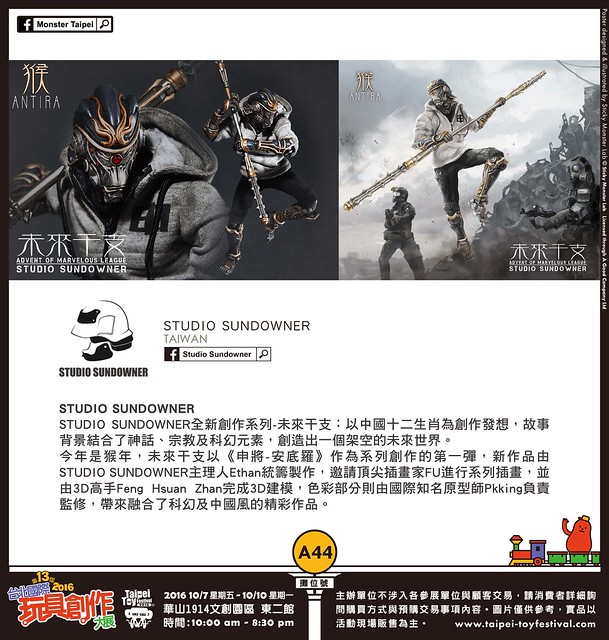 今年是猴年,未來干支以《申將-安底羅》作為系列創作的第一彈,新作品由STUDIO SUNDOWNER主理人Ethan統籌製作,邀請頂尖插畫家FU進行系列插畫,並由3D高手Feng Hsuan Zhan完成3D建模,色彩部分則由國際知名原型師Pkking負責監修,帶來融合了科幻及中國風的精彩作品。