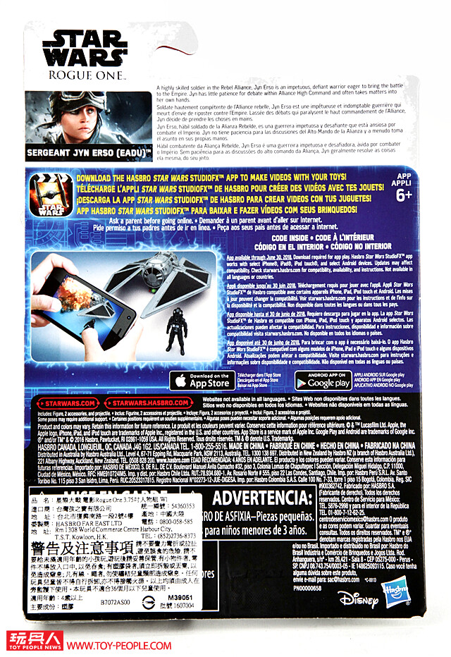 ▼ 包裝背面最主要是警語。 除此之外還宣傳了能夠搭配玩具一起玩的APP「STAR WARS Studio FX」。