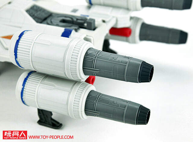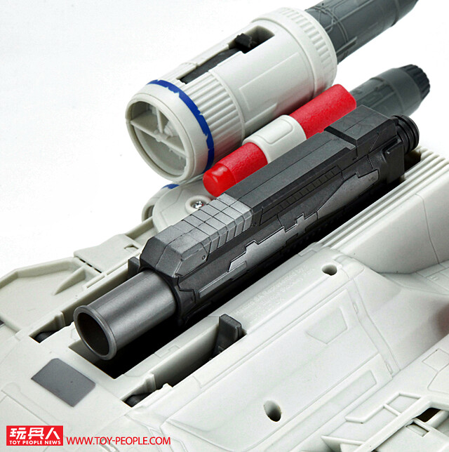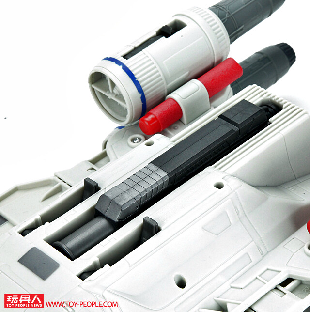▼ 這次3.75吋系列導入了好評的NERF子彈發射系統。 這個系統在於子彈的尺寸較大,不容易遺失,而且發射起來射速高、視覺效果又比較好,同時也較安全。在鈦打擊者戰機的底部設有發射裝置,能夠發射視覺效果十足的NERF子彈;另外,兩側機翼的底部也能夠收納備用的子彈。