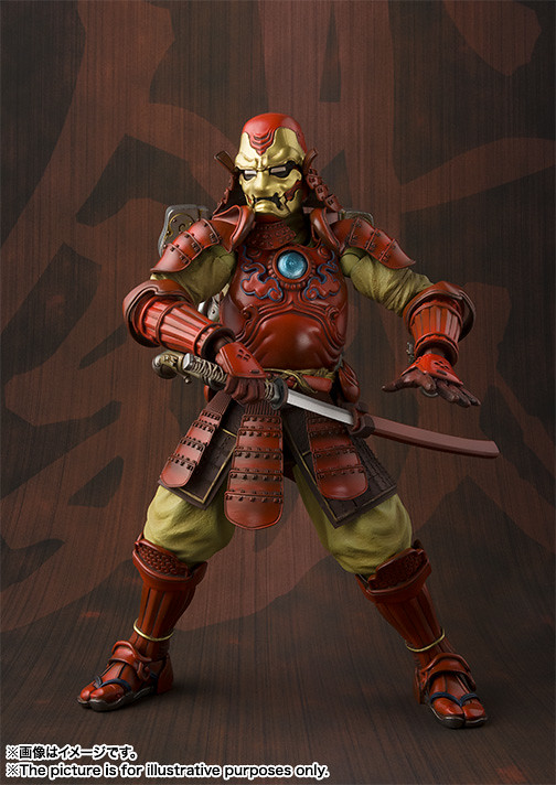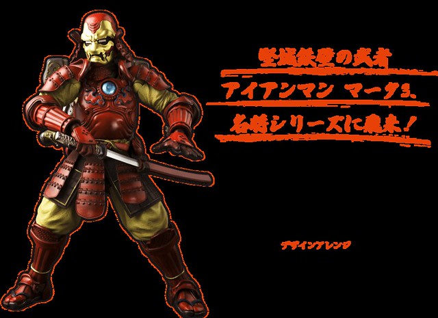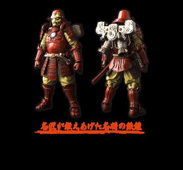 將美漫MARVEL經典的「鋼鐵人Iron Man」造型結合日式戰國時代的風格,以及「竹谷隆之」老師所精心設計的武士造型,並且以鋼鐵人可以「馳騁天空」的發想來打造飛行鋼鐵武士的裝甲造型!將經典的英雄角色化身為超強日本武士,身後巨大飛行背包上有著日式花紋雕飾的模樣,火槍砲也特別設計於手腕下方來呈現"鋼鐵人"時候的掌心發射孔,這樣轉化的巧思十分俯和「鋼鐵侍」的風格啊!