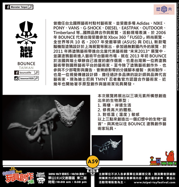 2007 年受邀華碩 (ASUS) 與 DELL 新款電腦機殼塗鴉設計於上海展覽等展出,參加過無數國內外的展覽,於2011 年將塗鴉藝術帶進台北當代美藝術館 “未末2013” 展覽中,並讓塗鴉藝術進入藝術平台藝術市場,就在 2013 年初 BOUNCE 於法國與瑞士舉辦自己首度的創作個展,也是台灣第一位將塗鴉藝術帶到國際藝術平台的藝術家。至今除了塗鴉藝術創作外,也參與不少部電影與廣告、音樂錄影帶的分鏡腳本繪製、美術製作,也是一位視覺傳達設計師,擔任過許多品牌的設計師與品牌代言藝術家。