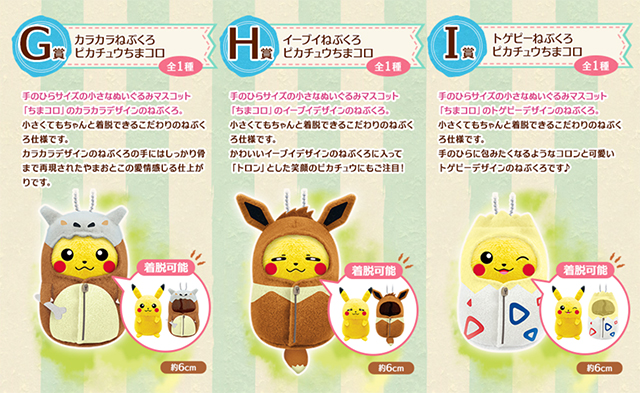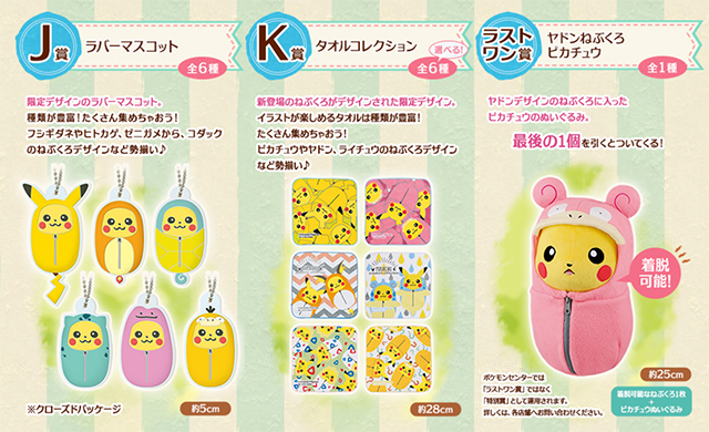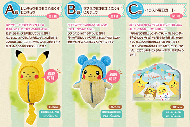 「皮卡丘 nebukuro collection」主打的是獎項中的皮卡丘布偶,布偶是以皮卡丘本體+寶可夢造型睡袋組成,睡袋可穿脫,全高約25cm,而不同睡袋造型的皮卡丘,表情也都不同。除了布偶外,、也有月曆、錢包、吊飾、毛巾等豐富的獎項,加上LAST ONE獎,全部共有12種獎項呢!