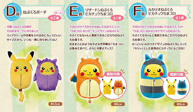 ▼D獎:睡袋皮卡丘錢包(皮卡丘、耿鬼);E獎:噴火龍軟綿綿睡袋皮卡丘;F獎:路卡利歐軟綿綿睡袋皮卡丘。