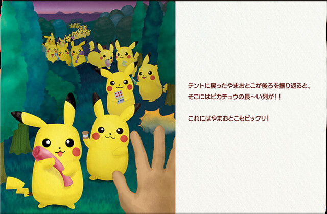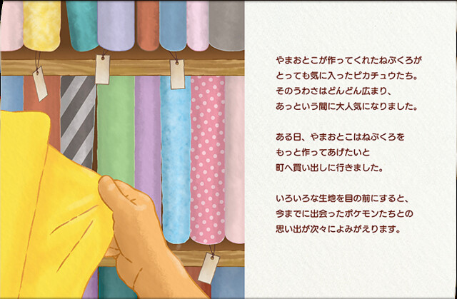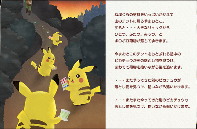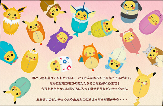 除了販售商品外,官方也繼續為「皮卡丘 nebukuro collection」安排了一段可愛的小故事介紹商品的由來,上一次提到遊戲中大家都很熟悉的NPC「山男」擅長製作睡袋,他的睡袋很受皮卡丘喜歡,這件事流傳開來後他的睡袋因此成為了人氣商品。有天他到鎮上買完睡袋的材料後,返回的路途上大背包中的材料卻不斷掉落,幸好皮卡丘們跟在他的後面一個個的撿起材料,山男發現背後跟著一大群的皮卡丘嚇了一跳,為了答謝幫忙撿材料的皮卡丘們,山男做了非常多的睡袋送給他們,讓皮卡丘們每晚都能幸福地睡在暖呼呼的睡袋裡。