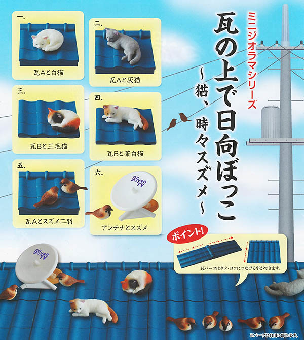 2017年1月19日新增官方宣傳照片與相關販售資訊,此次只要低單價的轉蛋作品就可以簡單組成"屋頂上"精彩的場景,也特別將多組的「屋瓦A」連結著「屋瓦B」上面再擺放著貓咪以及麻雀等等的樣貌,實在是十分推坑啊!並且在「屋瓦」的A、B兩款還有"縱向"與"橫向"不一樣的組合方式,讓玩家可以依照自己的喜好來組成面積不同的屋頂場景歐!喜愛貓咪的玩具人千萬別錯過這套轉蛋作品了啊!
