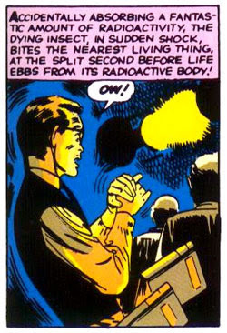 《Amazing Fantasy》第15期中,被蜘蛛咬傷的彼得因此獲得蜘蛛的能力 |