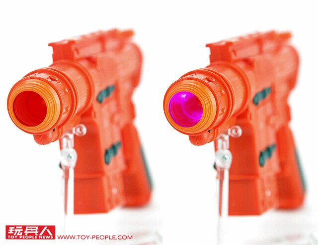 ▼ 接下來就是這次的重點 - 「發光打擊」(GLOW STRIKE)子彈! 這次的白色子彈採用的是配方調整過的蓄光子彈,但是在一般的室內燈光或陽光照射之後,並不會有蓄光(夜光)的效果。 必須藉由槍管中特殊設計的UV 紫外燈,就能讓子彈在短時間內充足的蓄光,發射之後子彈就會呈現發光的效果,並且短暫時間之後消失,藉此呈現出宛如電影中雷射槍射擊的視覺效果。
