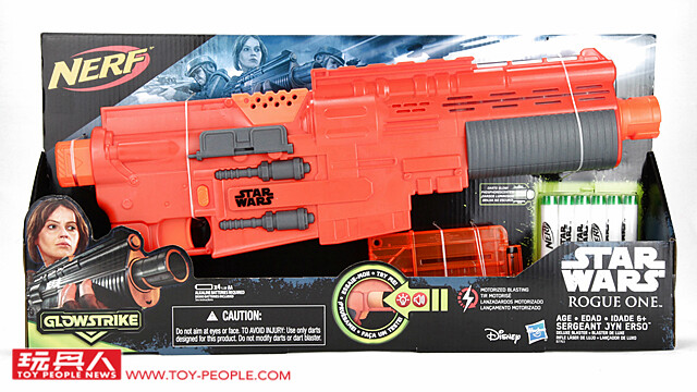 接下來進入讓大家最期待的NERF介紹啦! 這次NERF 對戰玩具槍《星際大戰外傳: 俠盜一號》主題系列商品,首波推出了三款電影中登場的槍枝(還有一把是美國大賣場Target 限定品)。分別是卡西恩·安道爾隊長(Captain Cassian Andor)的手槍、帝國死亡特種兵(Death Trooper)的衝鋒步槍與女主角琴·厄索(Jyn Erso)的步槍。 除了《俠盜一號》主題之外,這次商品最大的特色在於導入了「發光打擊」(GLOW STRIKE)的新功能~ 這新功能十分有趣,想瞭解更多就跟著我們的開箱報告往下看吧!