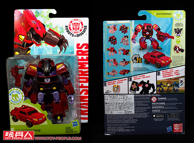 ▼ 破碎派克(Scatterspike/散刺箭),狂派的女性變形金剛,由越野SUV變形為擬豪豬機器人。玩具本身為刺火(Quillfire/火羽/刺熱箭)的重塗,外表改為較穩重的暗紅色調。