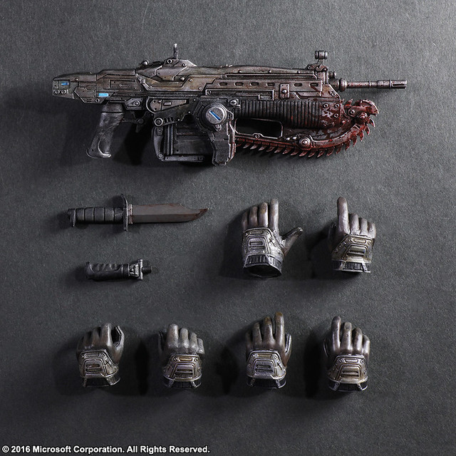 這次的作品將藉由PLAY ARTS改 系列能夠兼具可動性與細緻造型的製作技術,忠實地將馬可斯的造型完全重現。 其中馬可斯壯碩的身材、獨特的COG 裝甲造型(Coalition of Ordered Governments,維安政府聯盟,簡稱COG)皆細緻地刻畫了大量細節。 其中裝甲獨特的厚重、光澤效果還增加了舊化塗裝,更加增添人物身經百戰的氣息。 並且搭配了靈活的可動性,能夠重現原作中各式各樣的經典姿勢