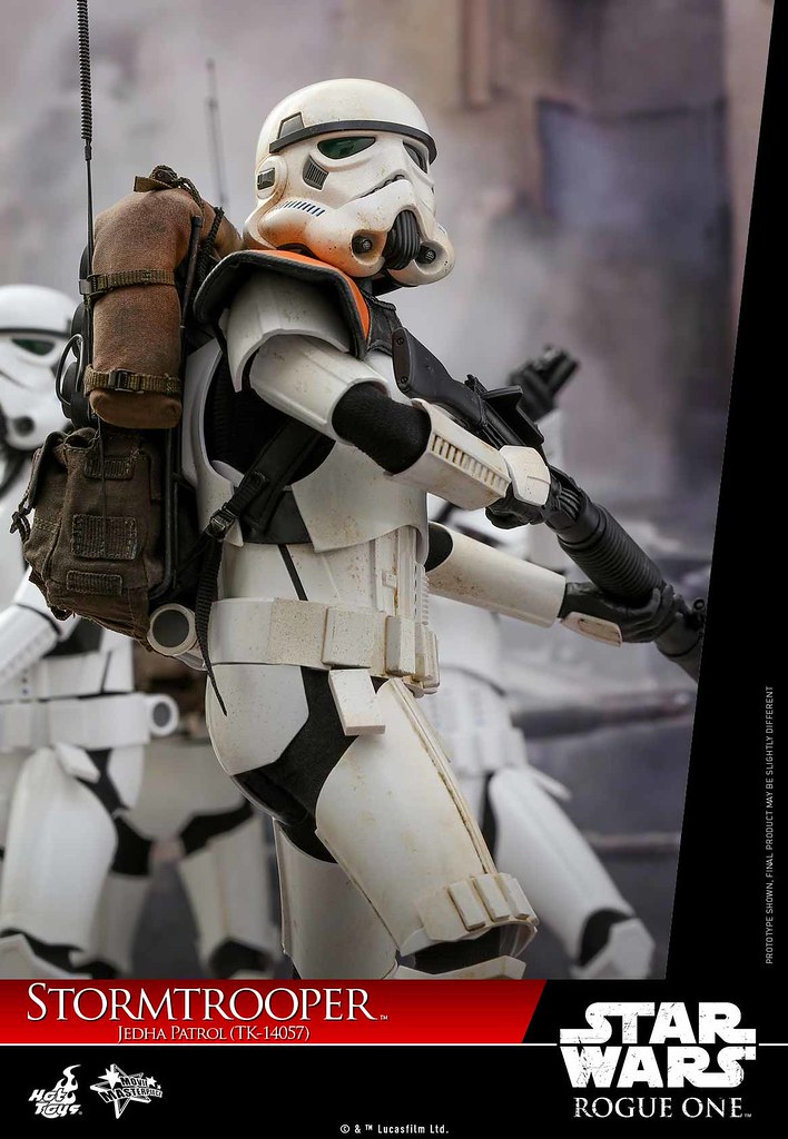 這次所發行的作品,是編號TK-14057 的杰達巡邏風暴兵,身配橘肩的他擔任著小隊長的職位,特別強調編號的他在劇中會是一個重要角色嗎? 這次的造型全部採用《星際大戰外傳:俠盜一號》的新規造型來製作,包括了全身的裝甲與氣候化塗裝,並搭配上全新開發的布料緊身衣,以及全新的背包還有小隊長標準配備的爆擊科技 T-21 輕型連發雷射步槍(BlasTech T-21 Light Repeating Blaster Rifle)。
