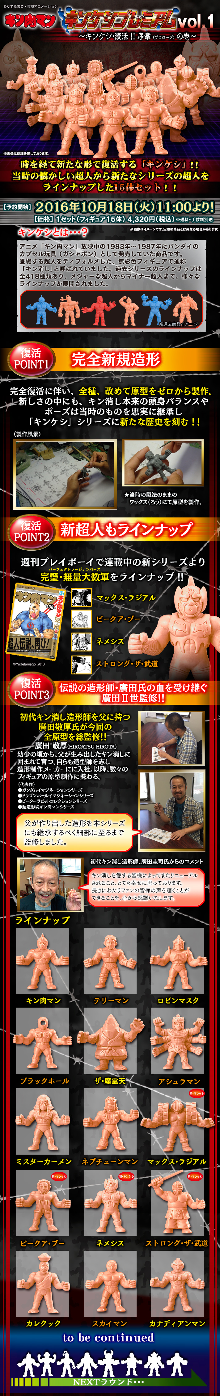 這次將一口氣一次推出約有15位的摔角超人,並且以完全新規造型來製作,也加入故事劇情裡面新登場的角色,連作品的原型製作也是由「廣田 圭司」的兒子「廣田 敬厚」第二代來執行,當然也以黑影的部分來預告將會推出"第二彈"的角色人物,早期的「金肉人 角色橡皮擦」系列當時可是推出有約418種類,此作預計在魂web線上商店於2016年10月18日開始接受訂購,對《金肉人》系列作有興趣的玩具人千萬別錯過了啊!