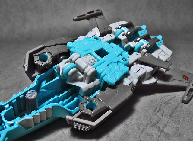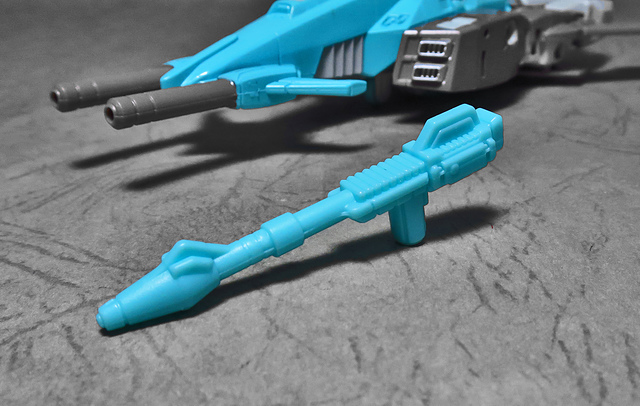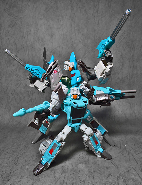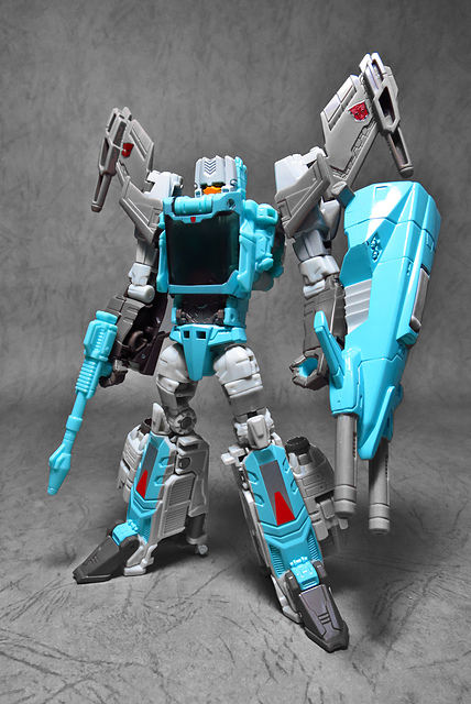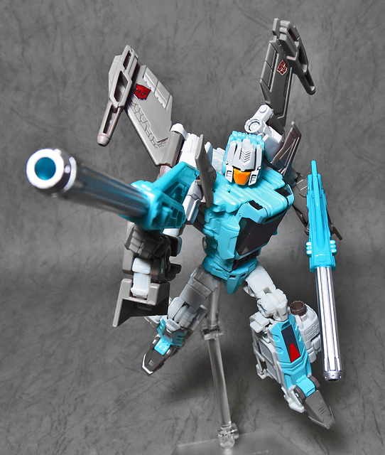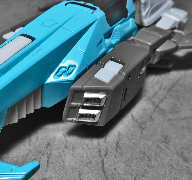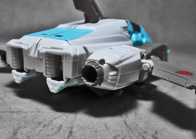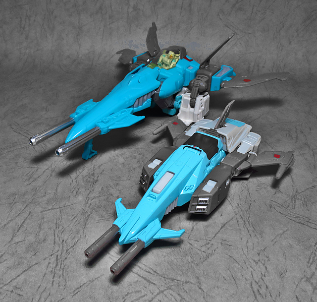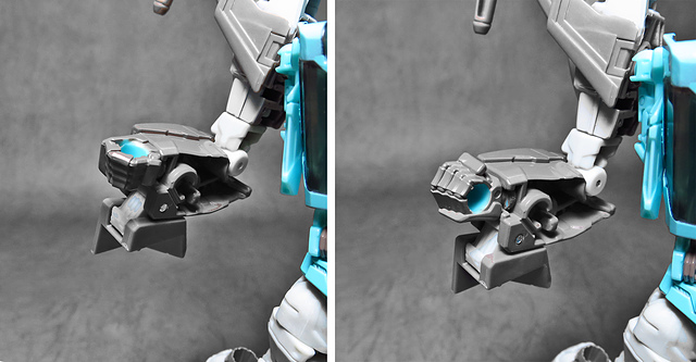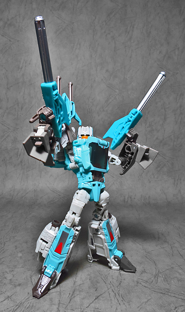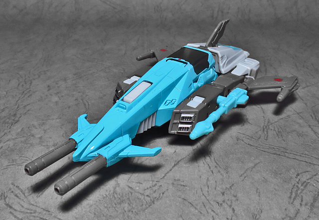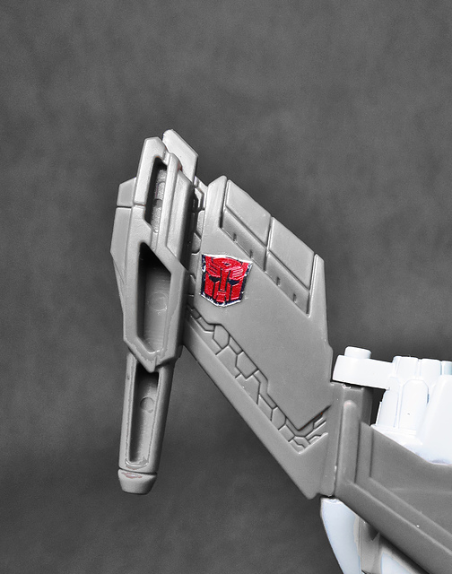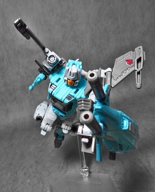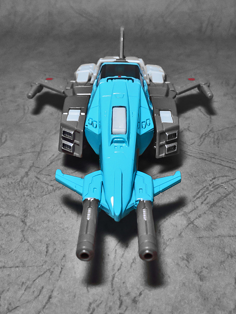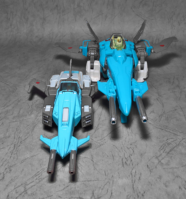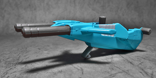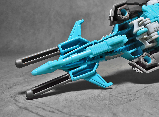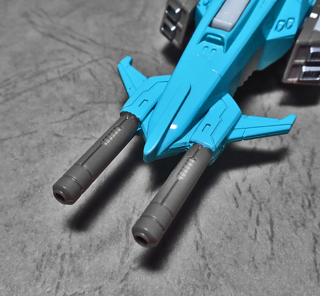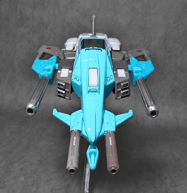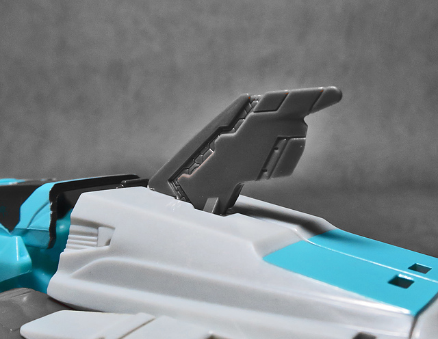 最容易被老玩家們詬病的,莫過於本來的雙槍被綁定在巨大的攻盾上,僅配給了和囉嗦相同的細瘦單槍,而飛機模式下兩塊垂直尾翼也因應了囉嗦的變形設計,從兩片被砍成了正中一片(機器人模式下,肩膀前那兩片是...假的!你眼睛業障重啊)