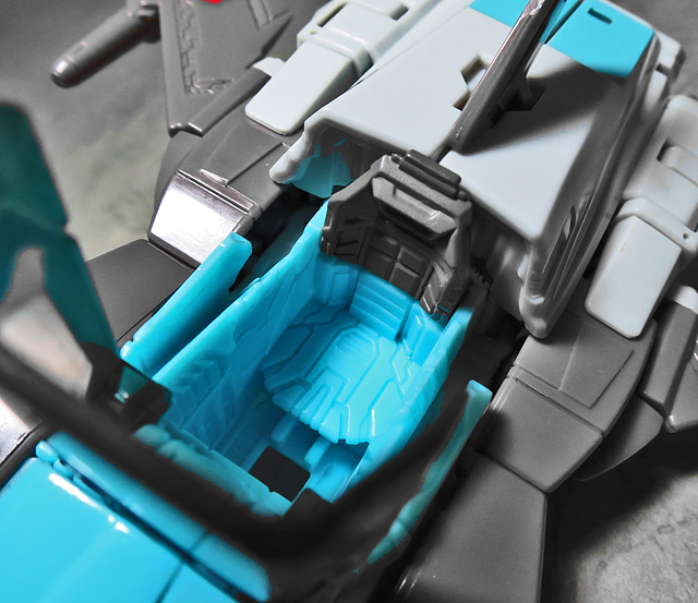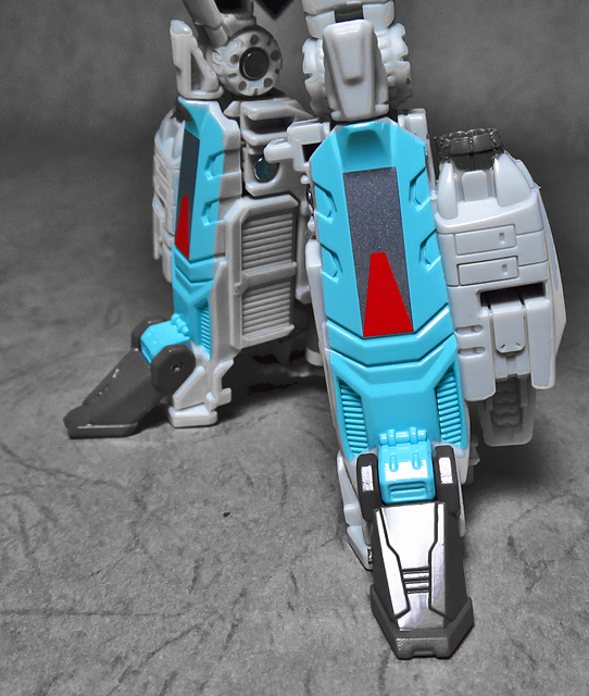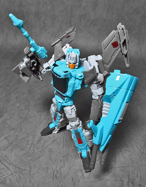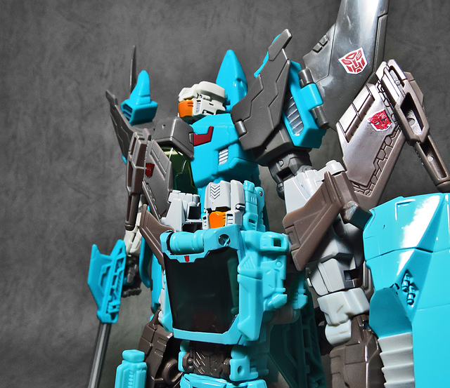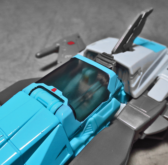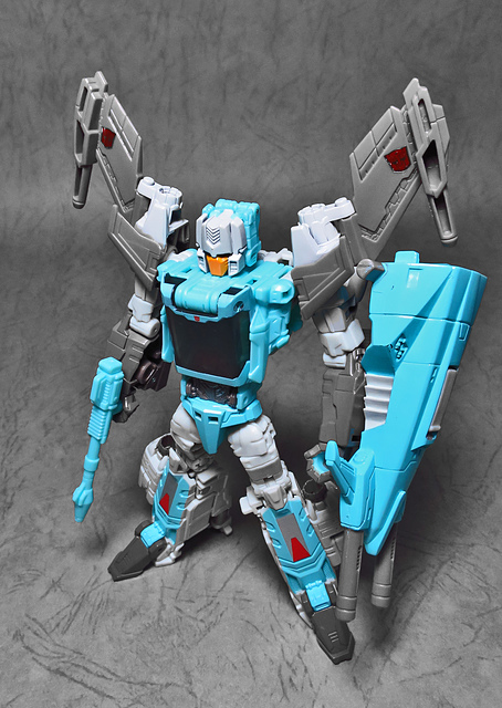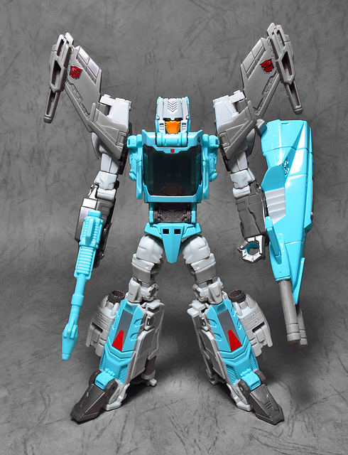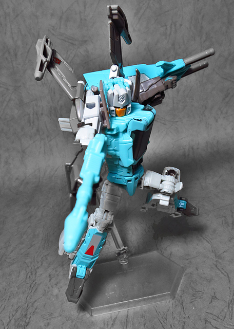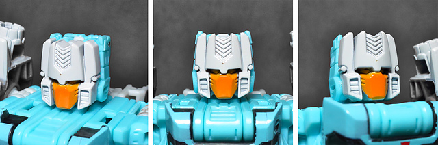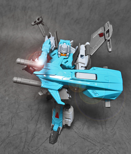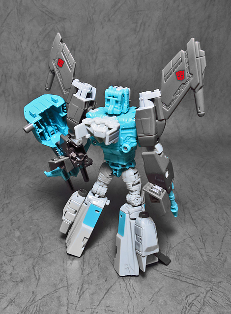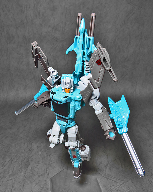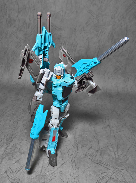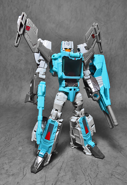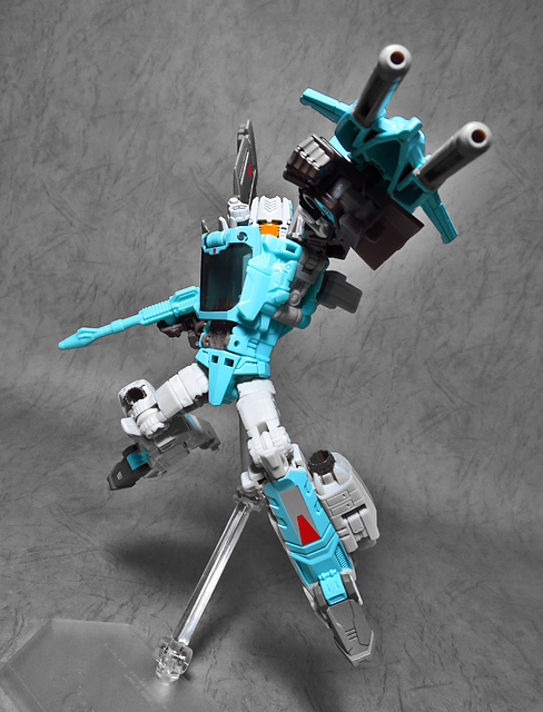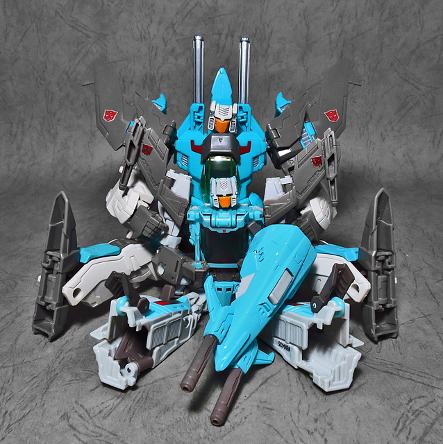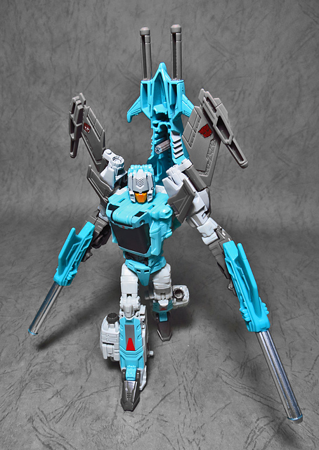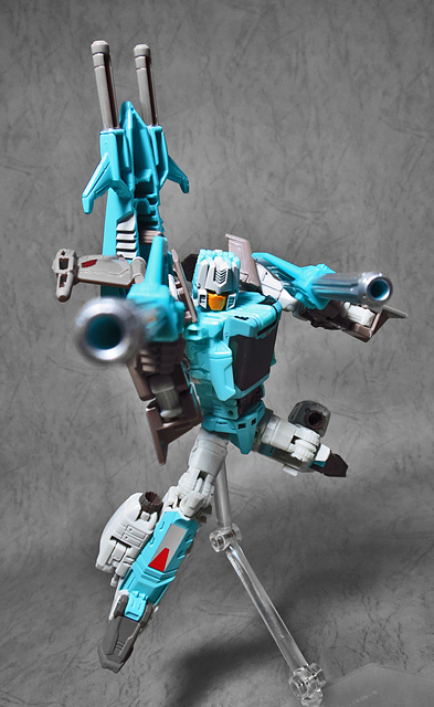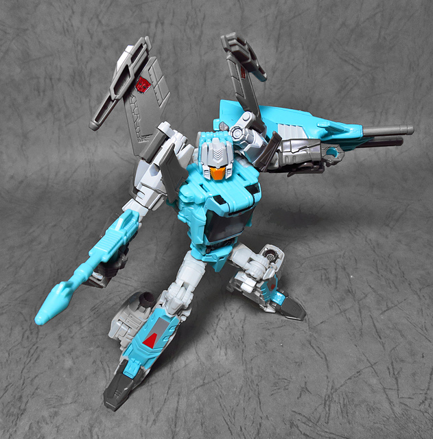 最容易被老玩家們詬病的,莫過於本來的雙槍被綁定在巨大的攻盾上,僅配給了和囉嗦相同的細瘦單槍,而飛機模式下兩塊垂直尾翼也因應了囉嗦的變形設計,從兩片被砍成了正中一片(機器人模式下,肩膀前那兩片是...假的!你眼睛業障重啊)