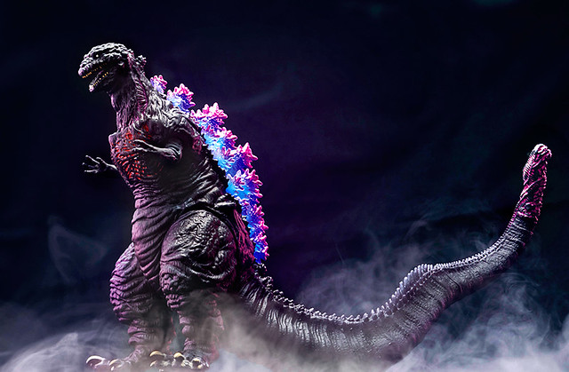 在觀看《正宗哥吉拉》時,想必會對哥吉拉那種身體發出紫光,前所未有的狀態大受衝擊並留下深刻的印象,而「USJ 哥吉拉 限定軟膠模型(暫稱)」也首次將電影中渾身發出紫光的哥吉拉立體呈現,商品色彩塗裝精緻,背鰭的部份使用了透明材質製成,可以呈現藍、紫兩種色彩的光芒,但本體內部是否藏有LED模組或預留設置空間都還不明朗。