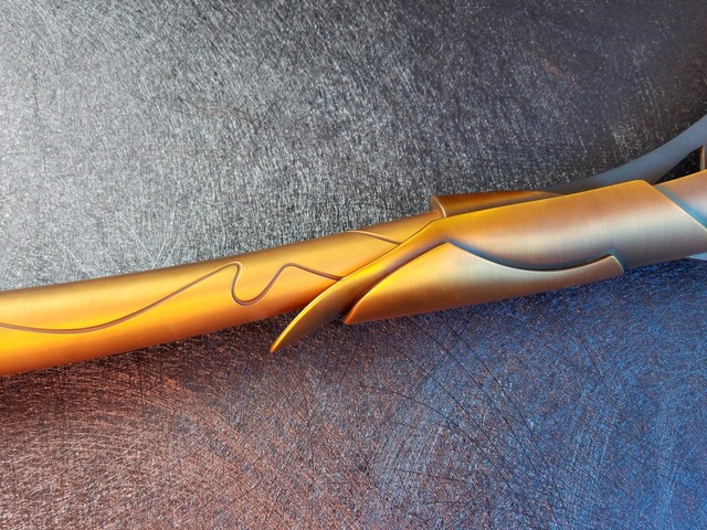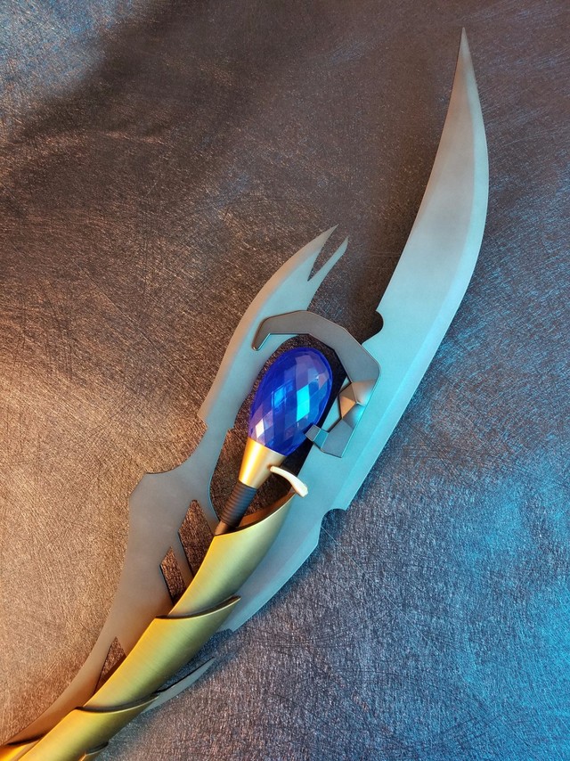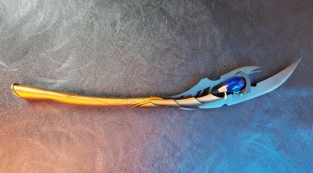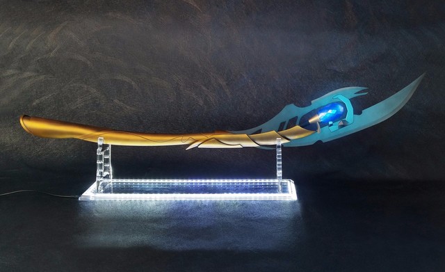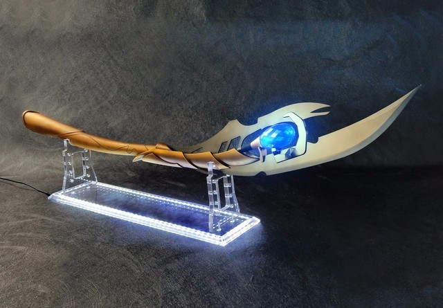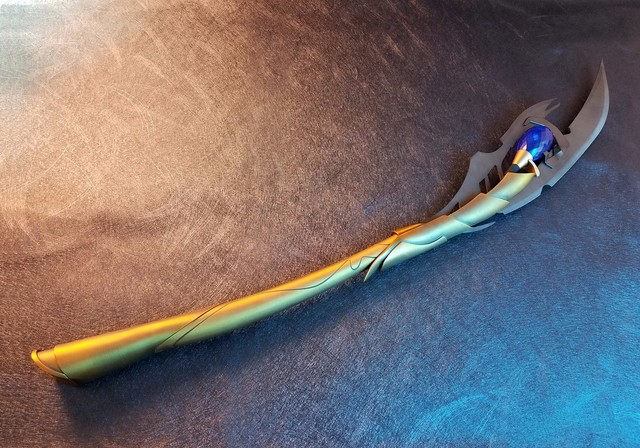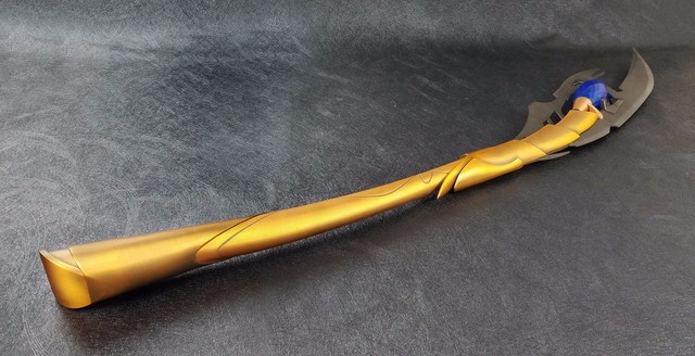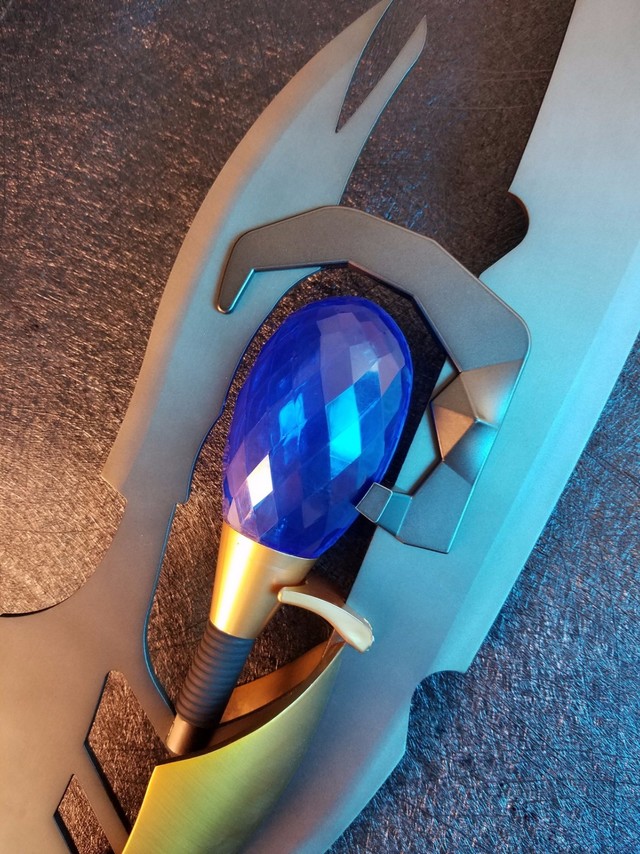 杖身以全電鍍合金製作,完美打磨技術配以高水準塗裝將其超完美實體化! 由於是金屬製品所以在製作中碰了不少壁,時間也用了 3 個多 4 個月才初步做了出來。但不太熟電子的東西所以第一次做起寶石的部份時,電阻太高,玩不到 3 分鐘就沒電了。經過多次改良後現在可以一顆電連續亮超過 40 小時。現在都放在房間內當長明燈用。哈哈!