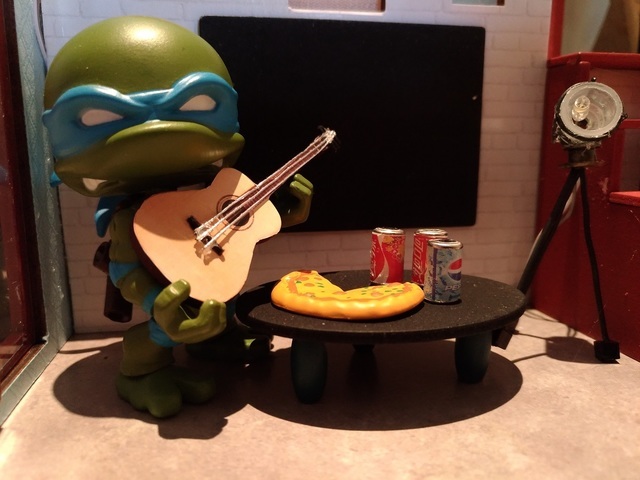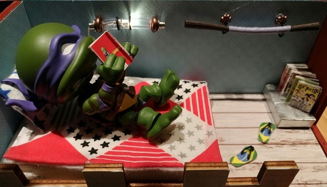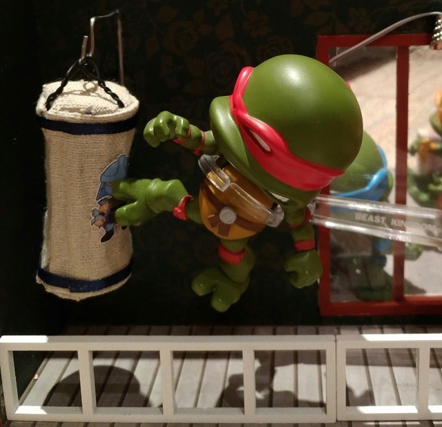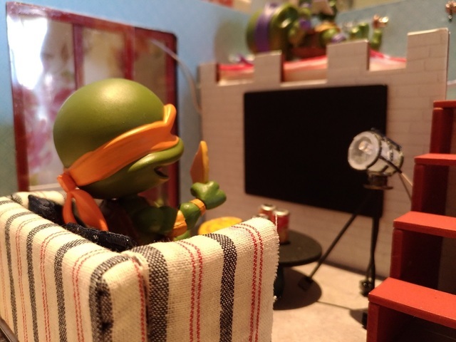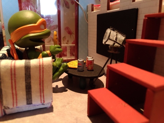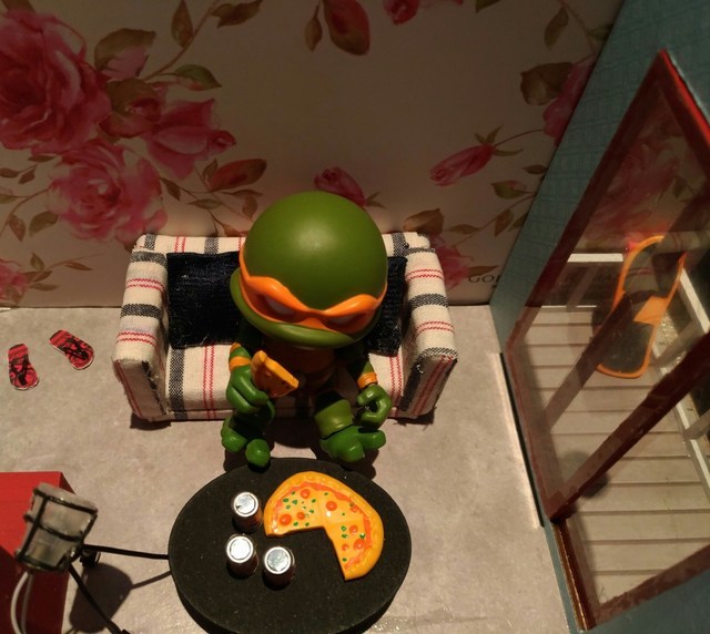 原先一開始想幫忍者龜跟黏土人打造一個適用的場景,開始找一些道具,可是大部分都是1/12的比例,對忍者龜來說太大了,於是開始找袖珍屋想說自己做看看,因為很多袖珍屋都是適合女生的,給忍者龜用有點娘娘的,找了好久終於找到一個合適的,而且做完發覺大小完全符合,自己覺得很滿意,哈哈