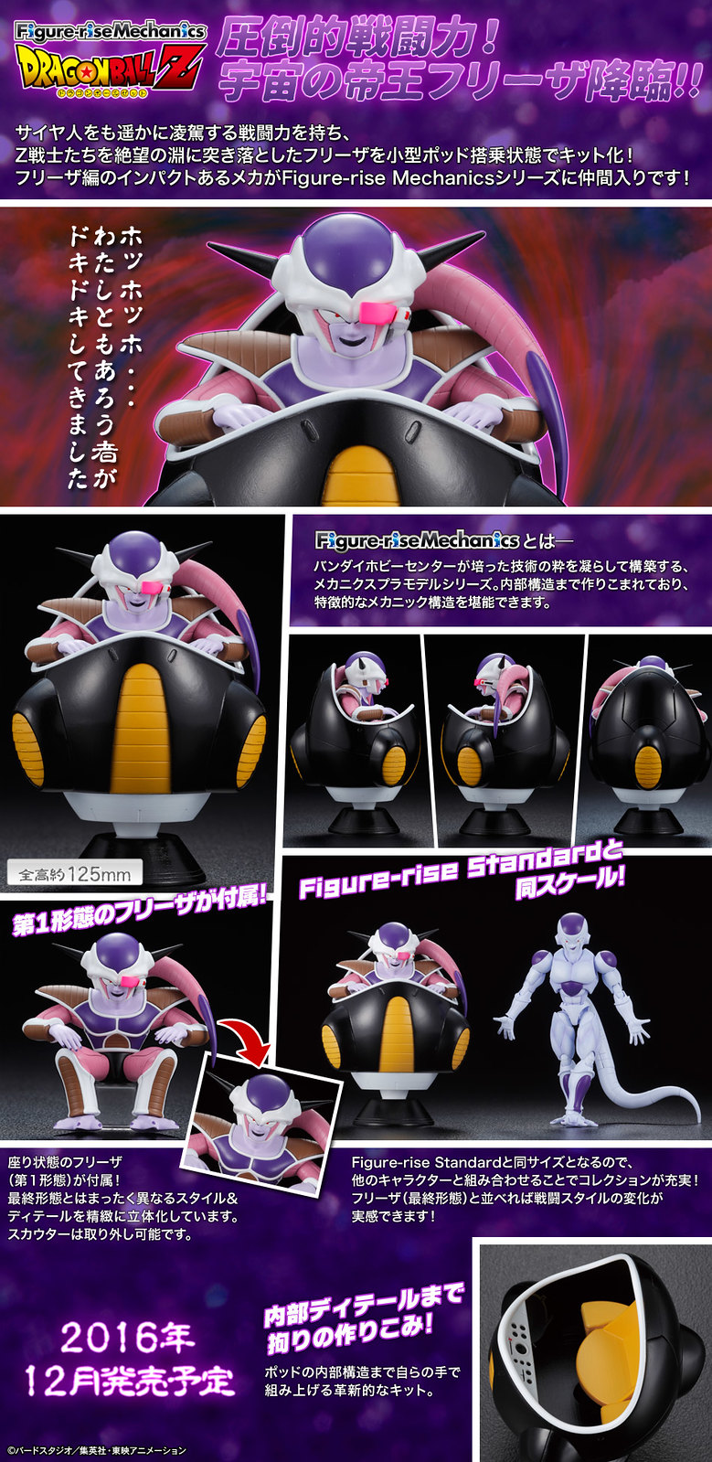 日BANDAI Hobby 事業部集結了多年來所累積的經驗與技術,開發出了造型表現更加優異、能夠打造出驚異的肌肉造型的全新技術「Muscle Build System」(肌肉建構系統,マッスルビルドシステム),推出震撼的全新模型系列『Figure-rise Standard』,這次將以『Figure-rise Mechanics』系列來推出劇中所出現的機械載具,首波已經公開了「賽亞人宇宙艙」,近日再公佈將推出「弗利沙的小型艙」フリーザの小型ポッド(名稱暫譯)。