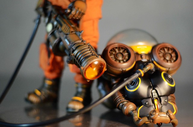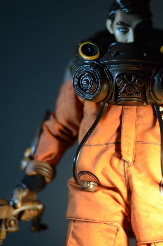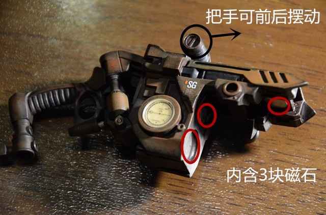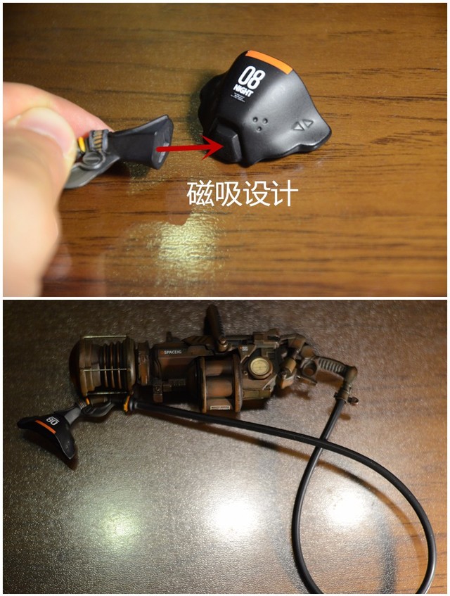 ▲槍托,頭部的把手可以前後移動, 握槍的時候起到穩定作用,槍托也是內含磁石的,便於幾個補件的連接。上面細節不用說,壓力錶的設計,雖然小,但是刻度表都清晰可見。