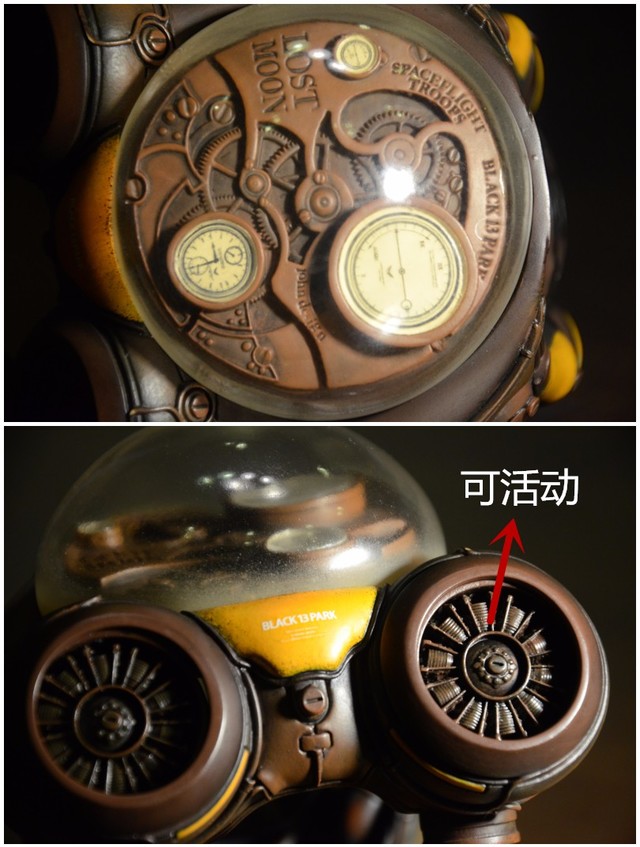 ▲背包,用了透明的蓋子,裡面的齒輪細節和儀錶盤的刻畫都很不錯,雖然這是從麻雀地台的縮小版,但是和這個背包渾然一體。背包下面的噴氣口是可以活動的。