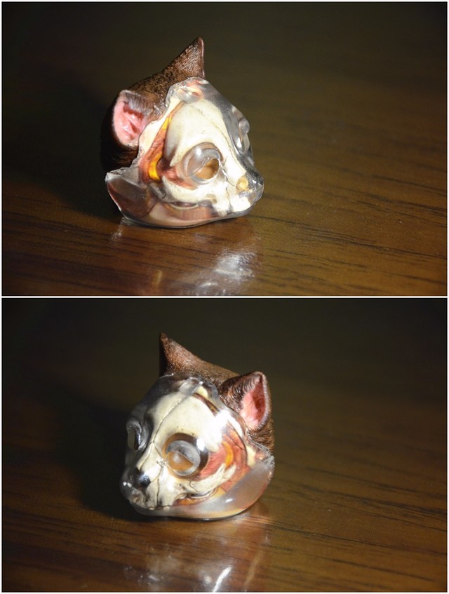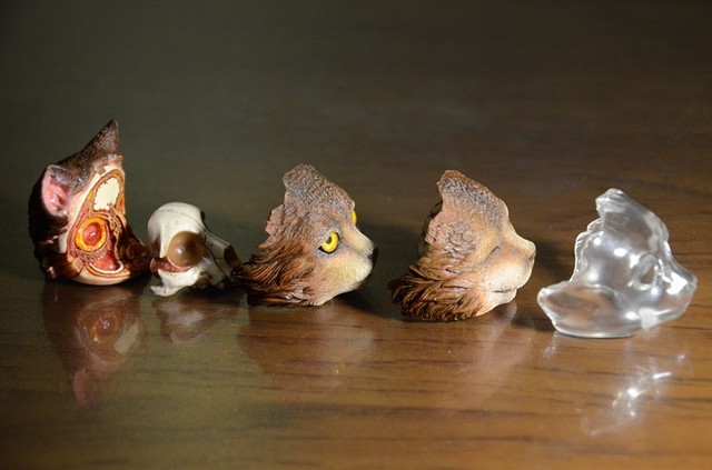▲貓頭,這次的貓頭採用了分層結構,有骨頭、有血肉,很是細緻。這款貓臉用的是樹脂材料,透明貓臉是軟膠,頭骨是pvc材質。