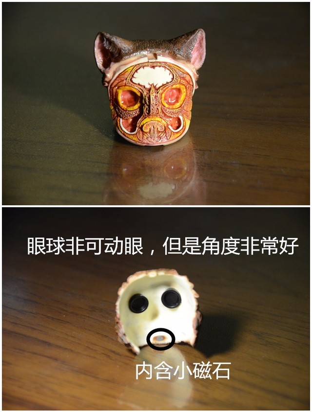 ▲貓頭側剖細節,不得不說血肉的分色處理,做出來的紋路跟真實的一樣。這款貓的眼睛不是可動眼,但是固定的角度很巧妙,拿的角度不同可以呈現不同的效果(正面呆萌,從上往下看,眼神就會多一些兇惡)貓面的下巴處有磁石,便於固定的更加牢固。