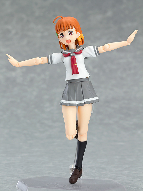 「figma 高海千歌」以浦之星女子學院的姿態登場,使用了Figma系列特有的關節能夠在保有外型的同時增加可動範圍,做出相當豐富的動作,附件中包含了「書包」、宣傳時使用的樸素道具「看板」和塑膠「大聲公」、代表色:蜜柑色的「啦啦隊彩球」,還特別附上「替換用赤腳零件」來重現動畫片尾曲中出現的形象喔!表情部份則有平時充滿元氣的「笑臉」、下定決心後幹勁十足的「幹勁臉」、害羞或不耐煩時露出的「瞇眼臉」,搭配豐富的配件盡情遊玩吧!