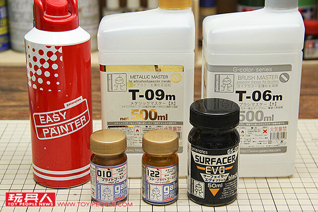 ▼ 修模都完成之後就可以準備上色了!準備好簡易噴灌、硝基漆溶劑T-06、金屬漆專用溶劑T-09、黑色補土、蓋亞010金色、蓋亞122星光金。
