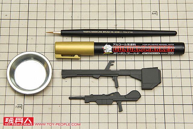 ▼ 武器部分可說是這組套件唯一需要補色的零件,準備好面相筆、金色鋼彈麥克筆、調色皿準備上色。