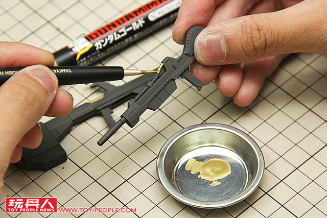 ▼ 將金色鋼彈麥克筆中的顏料擠在調色皿中,再以面相筆沾取塗裝。