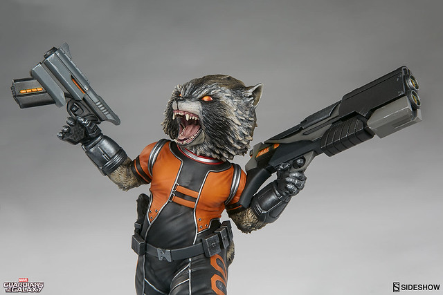 這次Sideshow 公司所推出「浣熊火箭」的雕像作品,小編覺得是將電影造型以及漫畫設定做了一個完美的詮釋。在火箭浣熊毛皮的雕刻栩栩如生,而疵牙咧嘴的兇狠模樣更是將其霸氣完全嶄露啊,搭配著拿著雙槍的造型,可說是十分有戲劇張力呢!