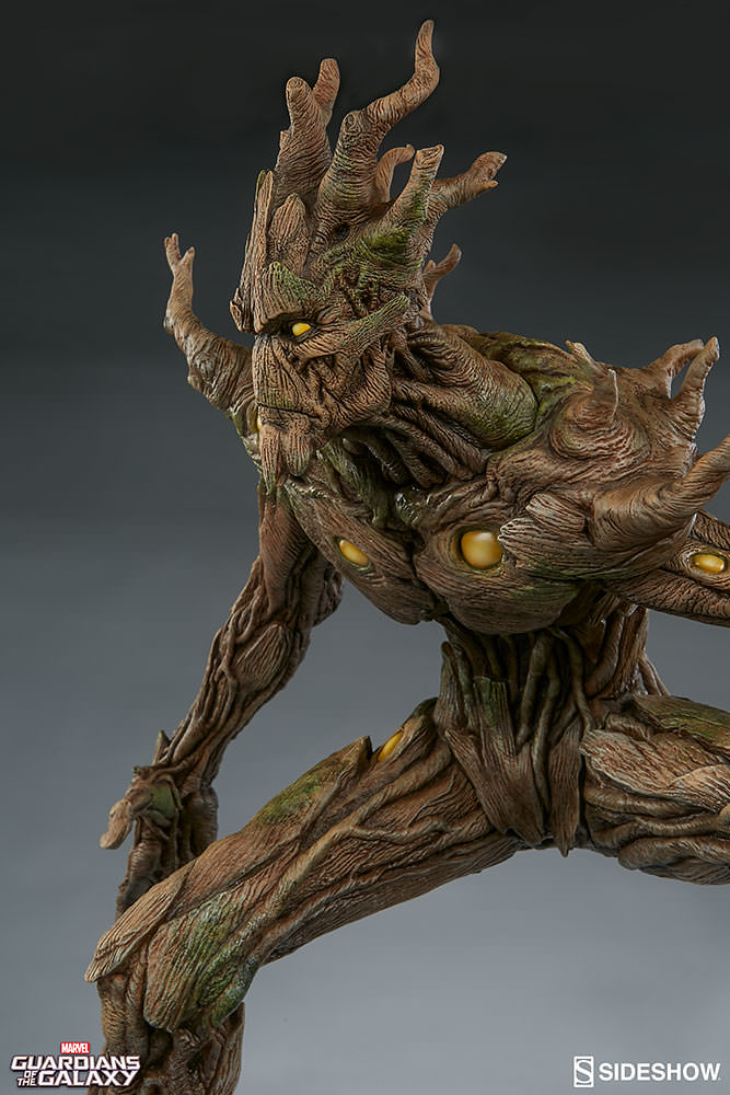 「樹人格魯特」是來自X 行星上一種樹木巨人種,他能夠吸收消化樹木做為食物,並且藉此能夠回復自己,在過去的故事中,他曾經三度被殺死,但最後都以枝芽的型態重新復活。除此之外,他也能夠控制樹木,不怕火焰。而這次Sideshow 特別在限定版的配件附上了一個可替換的攻擊造型手臂配件,搭配火箭浣熊可說是帥翻天了啊!
