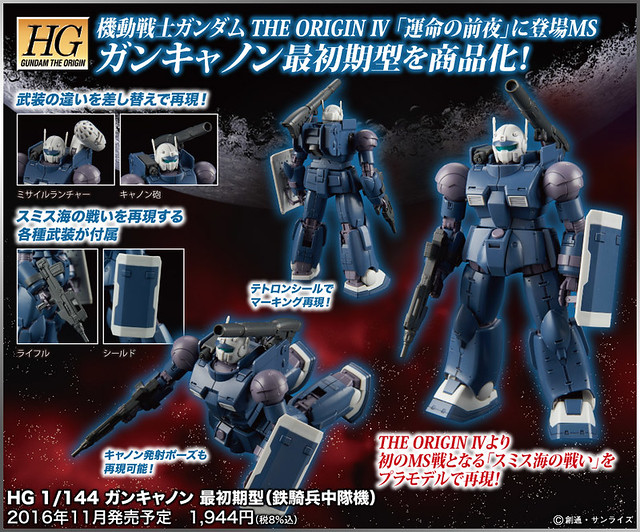 日Bandai萬代玩具公司將推出登場於《機動戰士鋼彈 THE ORIGIN》IV 的「命運的前夜(運命の前夜)」章節的鋼加農(ガンキャノン) 最初期型(鐵騎兵中隊機),此次作品可以再現肩上更換武裝的模樣,還有經典火炮射擊的姿勢當然也可以重現,另外附有噴射導彈發射器(スプレーミサイルランチャー)、射擊火炮(キャノン砲)、步槍(ライフル)和防護盾(シールド)等等裝備,提供給喜愛《機動戰士鋼彈》HG模型系列作的玩具人參考。