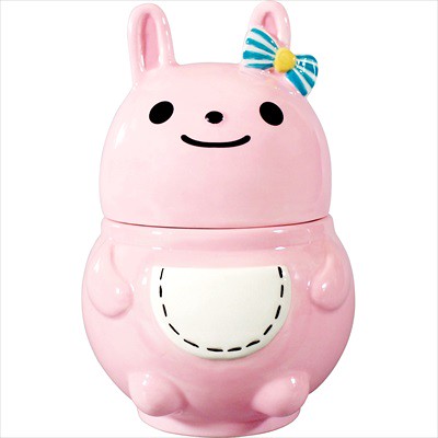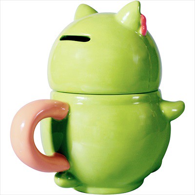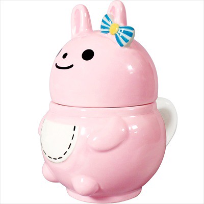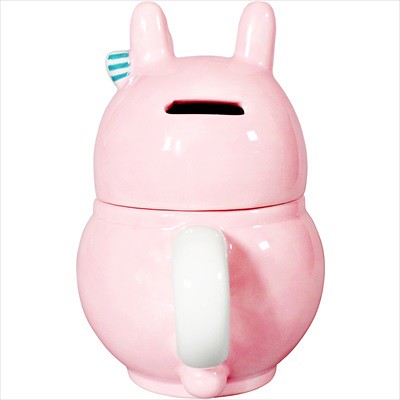 「杏的兔子/P太 吉祥物存錢桶馬克杯」是以陶瓷製成的容器,全高大約14公分,外表圓滾滾的相當可愛。頭部後方開有投幣孔,可以當作存錢桶使用,此外背上還有杯柄,只要將頭部取下就能變身成馬克杯喔!一邊看著他們可愛的臉,一邊用著他們的身體喝飲料,輕鬆又治癒心靈啊!(太獵奇了吧!)。