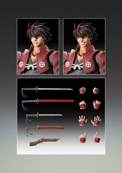 這次作品附有通常顔與狂氣的笑顔兩款不同表情配件可以替換,多款不同手首配件,武器有武士刀與短刀都有收納在刀銷內與使用兩種狀態呈現,以及劇中隨身所拿較小尺寸的火槍附屬其中,官網也公開了將陸續推出劇中登場的「織田信長」與「那須與一」的超像可動作品,喜愛《漂流武士》系列作的玩具人可以參考一下歐!